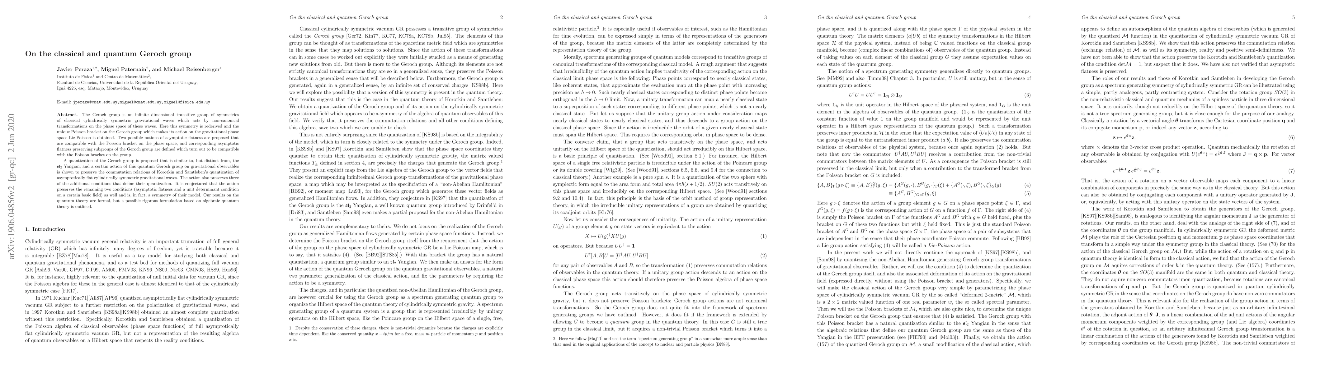 The Geroch group is an infinite dimensional transitive group of symmetries of classical cylindrically symmetric gravitational waves which acts by non-canonical transformations on the phase space of these waves. Here this symmetry is rederived and the unique Poisson bracket on the Geroch group which makes its action on the gravitational phase space Lie-Poisson is obtained. Two possible notions of asymptotic flatness are proposed that are compatible with the Poisson bracket on the phase space, and corresponding asymptotic flatness preserving subgroups of the Geroch group are defined which turn out to be compatible with the Poisson bracket on the group. A quantization of the Geroch group is proposed that is similar to, but distinct from, the $\mathfrak{sl}_2$ Yangian, and a certain action of this quantum Geroch group on gravitational observables is shown to preserve the commutation relations of Korotkin and Samtleben's quantization of asymptotically flat cylindrically symmetric gravitational waves. The action also preserves three of the additional conditions that define their quantization. It is conjectured that the action preserves the remaining two conditions (asymptotic flatness and a unit determinant condition on a certain basic field) as well and is, in fact, a symmetry of their model. Our results on the quantum theory are formal, but a possible rigorous formulation based on algebraic quantum theory is outlined.