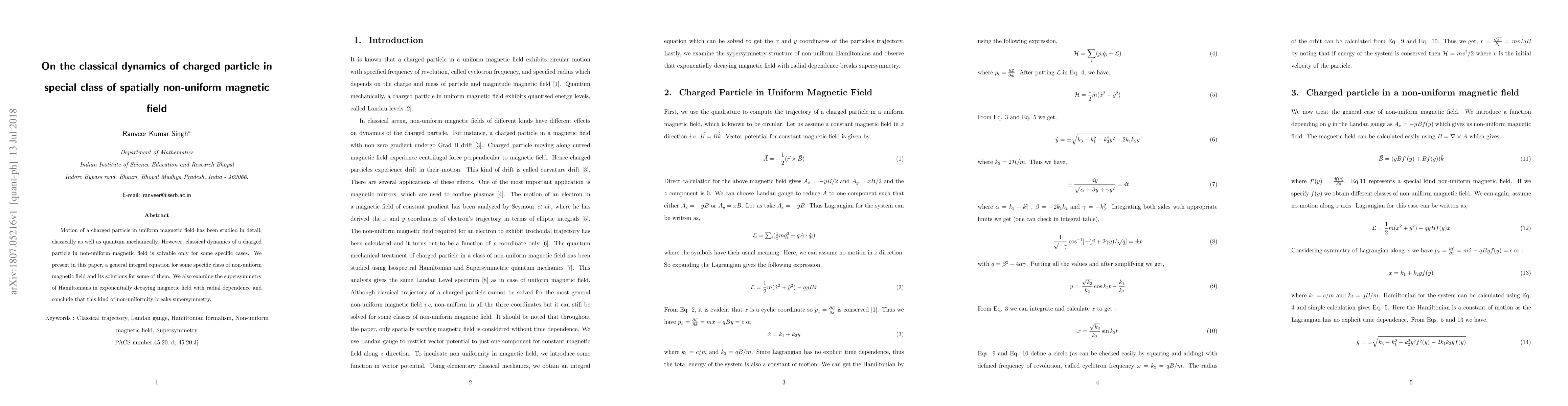 Motion of a charged particle in uniform magnetic field has been studied in detail, classically as well as quantum mechanically. However, classical dynamics of a charged particle in non-uniform magnetic field is solvable only for some specific cases. We present in this paper, a general integral equation for some specific class of non-uniform magnetic field and its solutions for some of them. We also examine the supersymmetry of Hamiltonians in exponentially decaying magnetic field with radial dependence and conclude that this kind of non-uniformity breaks supersymmetry.