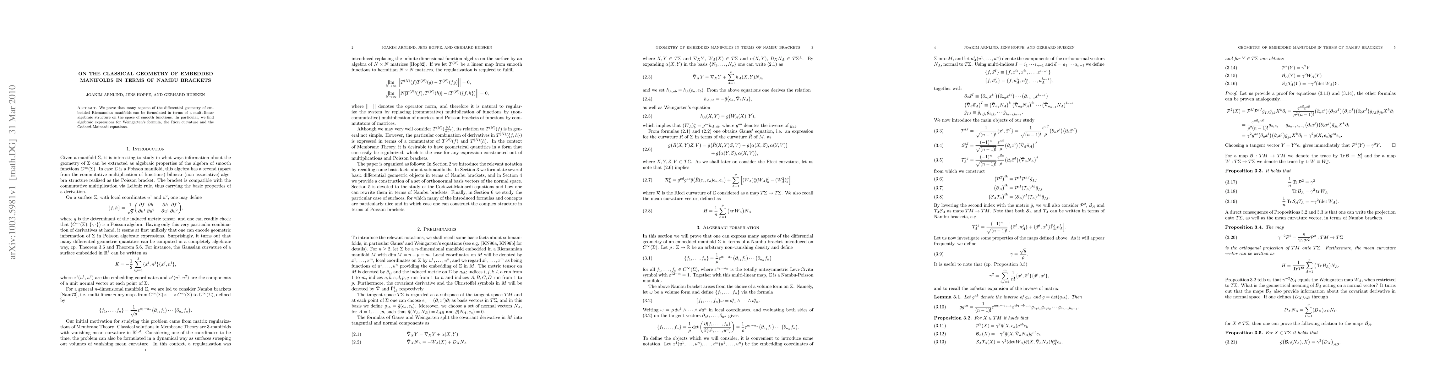 We prove that many aspects of the differential geometry of embedded Riemannian manifolds can be formulated in terms of a multi-linear algebraic structure on the space of smooth functions. In particular, we find algebraic expressions for Weingarten's formula, the Ricci curvature and the Codazzi-Mainardi equations.