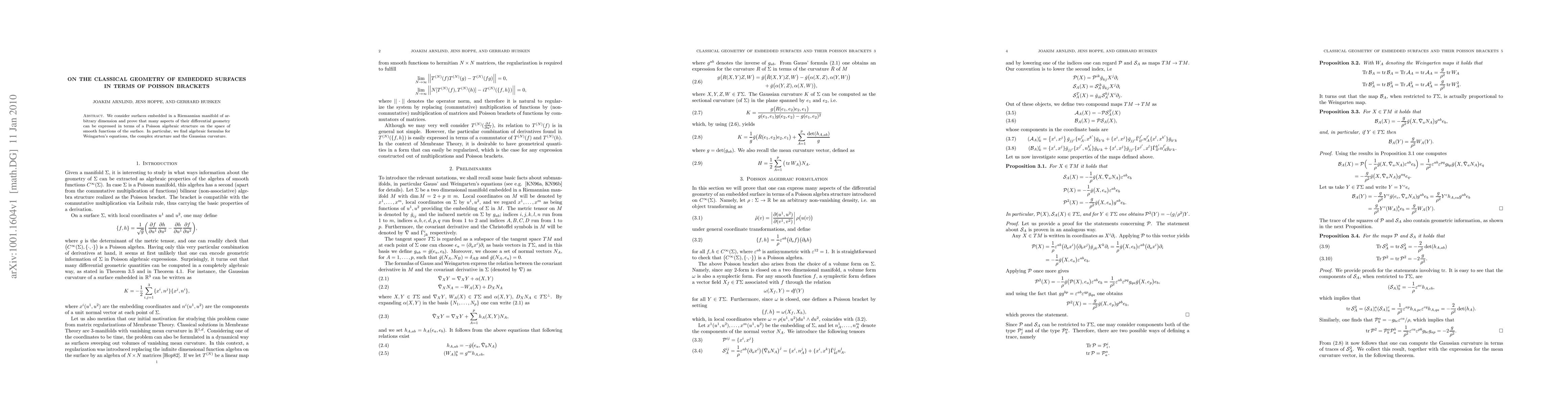 We consider surfaces embedded in a Riemannian manifold of arbitrary dimension and prove that many aspects of their differential geometry can be expressed in terms of a Poisson algebraic structure on the space of smooth functions of the surface. In particular, we find algebraic formulas for Weingarten's equations, the complex structure and the Gaussian curvature.