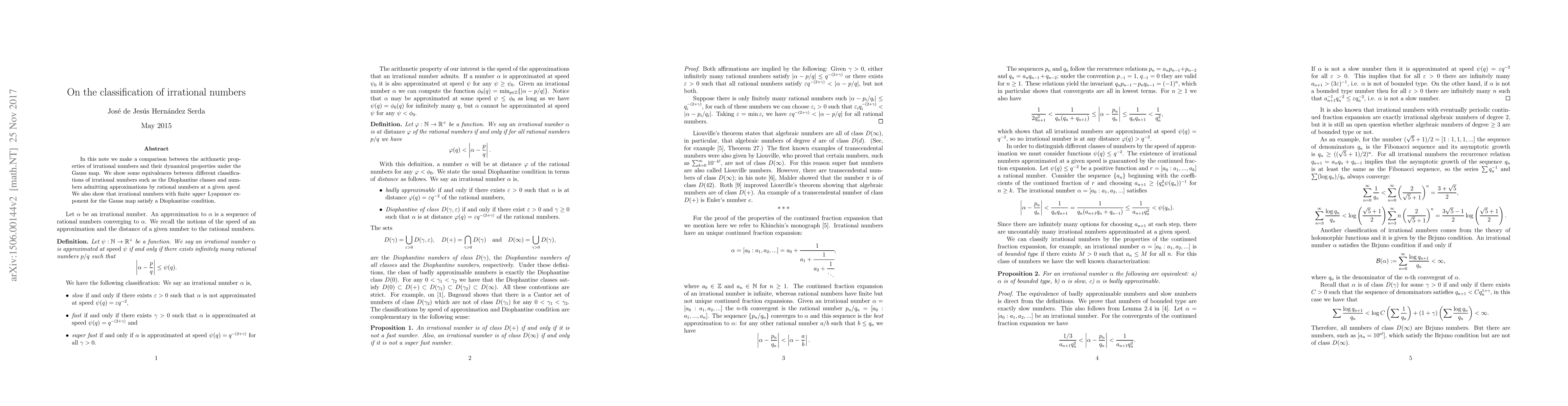 In this notes we make a comparison between the arithmetic properties of irrational numbers and their dynamical properties under the Gauss map. We show some equivalences between different classifications of irrational numbers such as the Diophantine classes and numbers admitting approximations by rational numbers at a given 'speed'. We also show that irrational numbers with finite upper Lyapunov exponent for the Gauss map satisfy a Diophantine condition.
