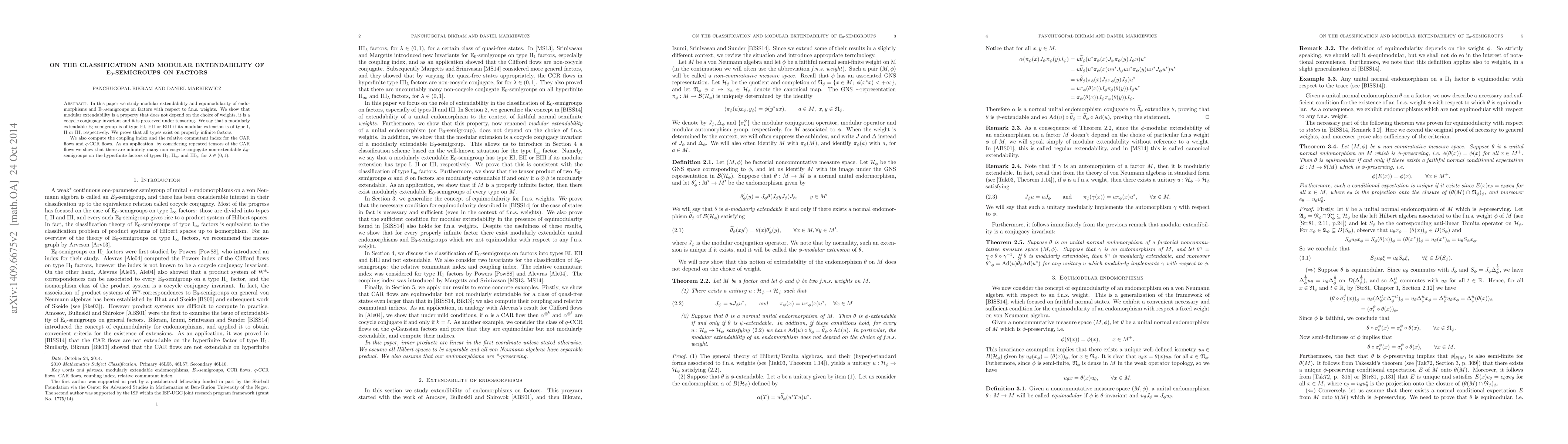 In this paper we study modular extendability and equimodularity of endomorphisms and E$_0$-semigroups on factors with respect to f.n.s. weights. We show that modular extendability is a property that does not depend on the choice of weights, it is a cocycle conjugacy invariant and it is preserved under tensoring. We say that a modularly extendable E$_0$-semigroup is of type EI, EII or EIII if its modular extension is of type I, II or III, respectively. We prove that all types exist on properly infinite factors. We also compute the coupling index and the relative commutant index for the CAR flows and $q$-CCR flows. As an application, by considering repeated tensors of the CAR flows we show that there are infinitely many non cocycle conjugate non-extendable $E_0$-semigroups on the hyperfinite factors of types II$_1$, II$_{\infty}$ and III$_\lambda$, for $\lambda \in (0,1)$.