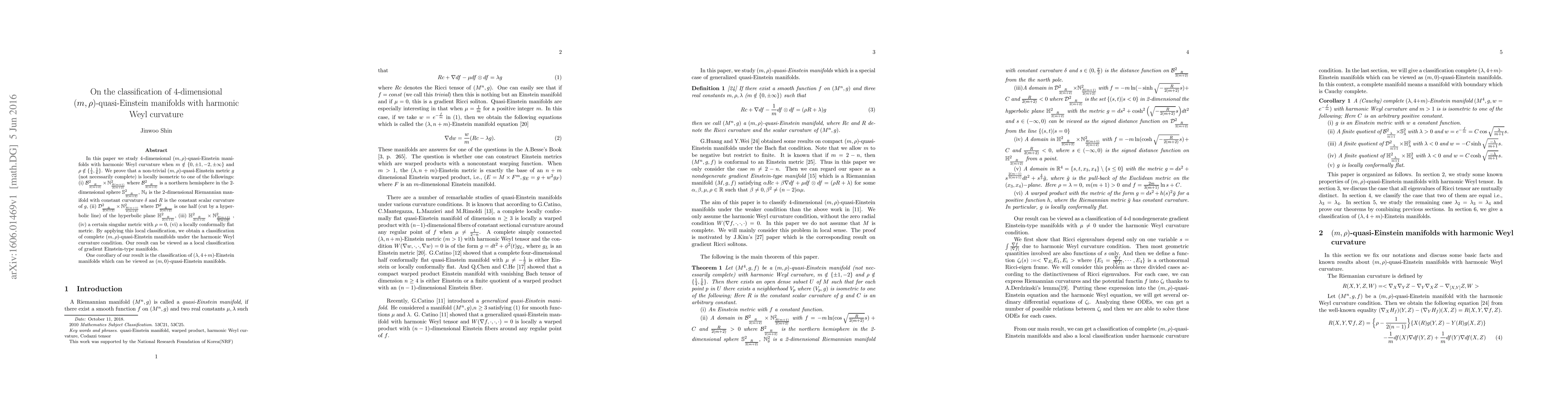 This paper classifies 4-dimensional $(m,\rho)$-quasi-Einstein manifolds with harmonic Weyl curvature, proving that they are locally isometric to specific geometric structures, and extends this classification to complete manifolds. The key results include the identification of various locally conformally flat metrics and a classification of $(\lambda,4+m)$-Einstein manifolds.