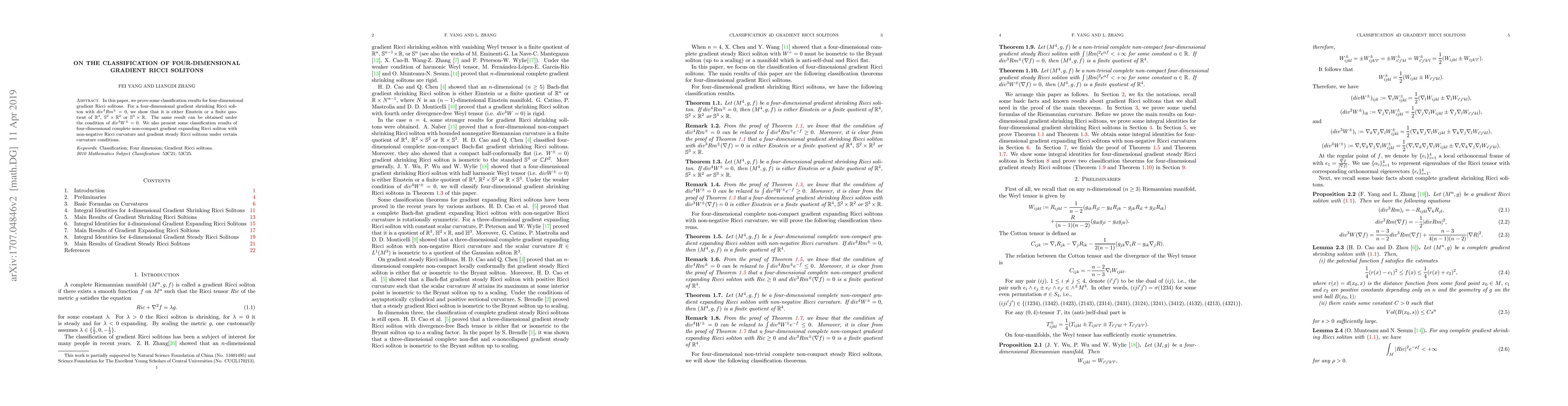 This paper classifies four-dimensional gradient Ricci solitons, showing that under specific conditions, they are either Einstein metrics or finite quotients of particular spaces. It also discusses classification results for complete non-compact expanding solitons with non-negative Ricci curvature and steady solitons under certain curvature conditions.