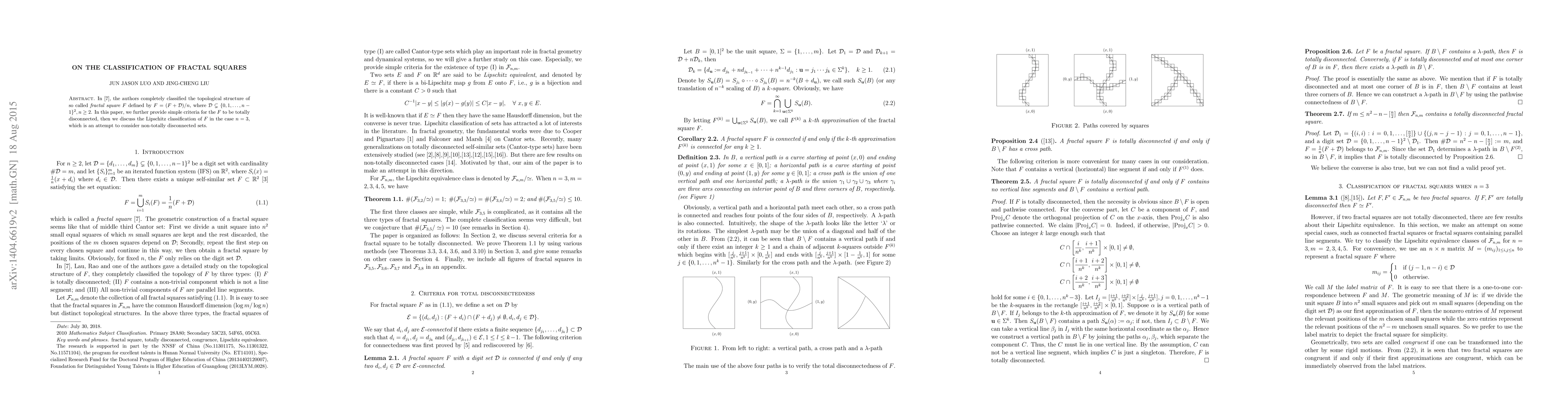 This paper builds upon a previous classification of fractal squares by providing criteria for a fractal square to be totally disconnected and exploring the Lipschitz classification for a specific case.