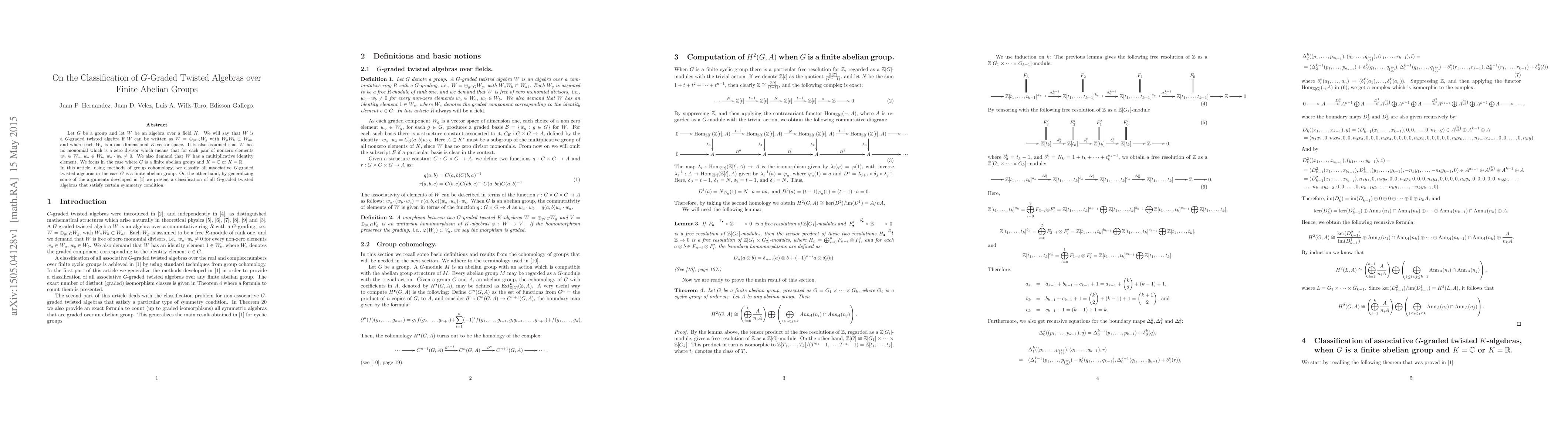 This research classifies all associative G-graded twisted algebras over finite abelian groups using group cohomology methods. It also presents a symmetry-condition-based classification, building on previous work.