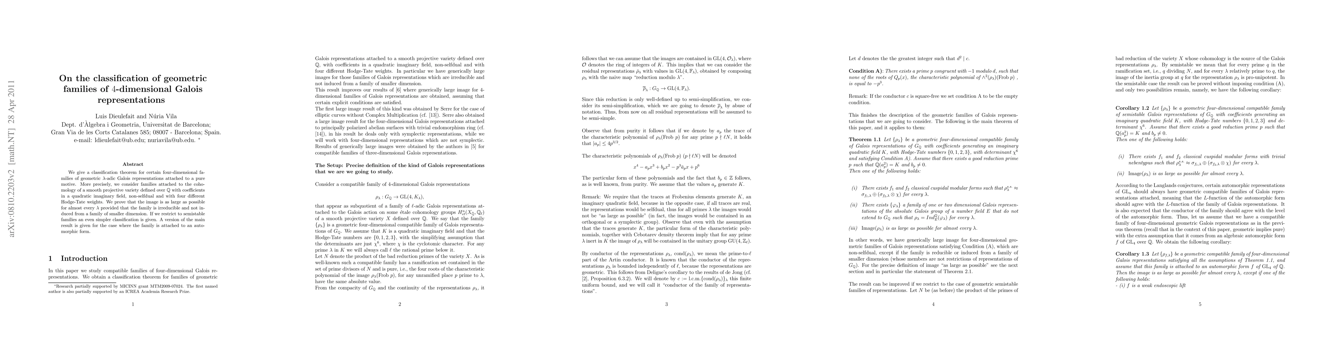 We give a classification theorem for certain four-dimensional families of geometric $\lambda$-adic Galois representations attached to a pure motive. More precisely, we consider families attached to the cohomology of a smooth projective variety defined over $\Q$ with coefficients in a quadratic imaginary field, non-selfdual and with four different Hodge-Tate weights. We prove that the image is as large as possible for almost every $\lambda$ provided that the family is irreducible and not induced from a family of smaller dimension. If we restrict to semistable families an even simpler classification is given. A version of the main result is given for the case where the family is attached to an automorphic form.