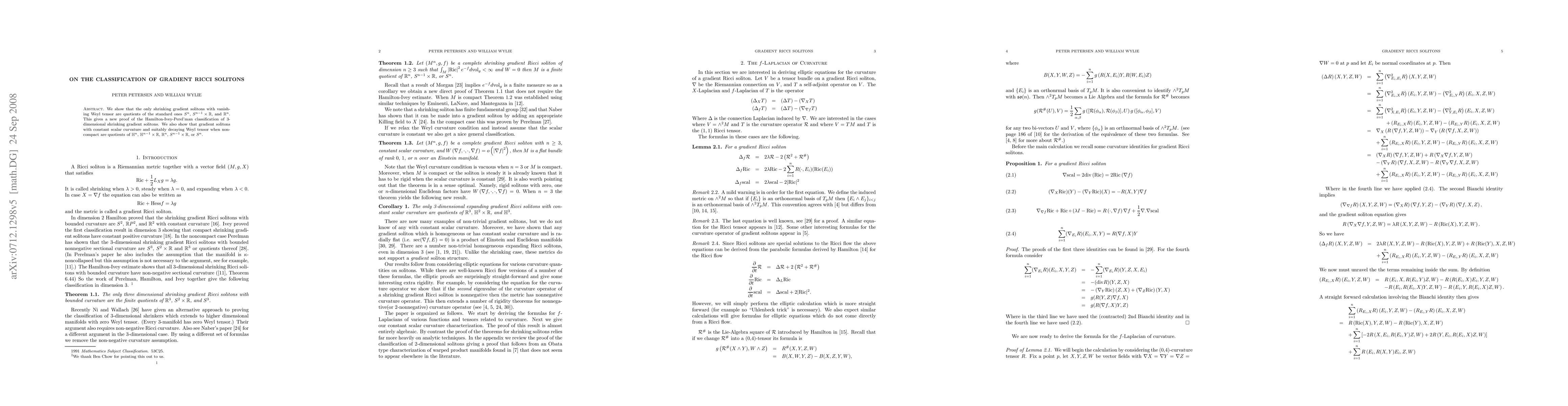 The paper classifies complete shrinking gradient Ricci solitons with vanishing Weyl tensor as quotients of standard solitons, providing a new proof for the Hamilton-Ivey-Perel'man classification of 3-dimensional solitons. It also classifies expanding gradient Ricci solitons with constant scalar curvature and suitably decaying Weyl tensor.