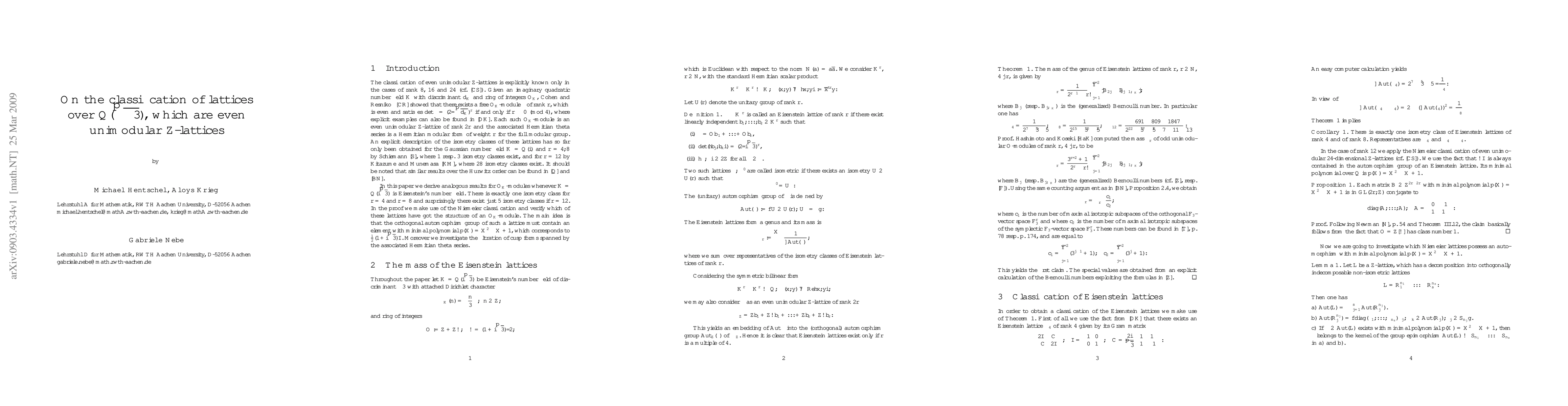This paper classifies even unimodular $\Z$-lattices of ranks 4, 8, and 12 over $\Q(\sqrt{-3})$, and constructs associated Hermitian modular forms through theta series, computing their filtration of cusp forms.