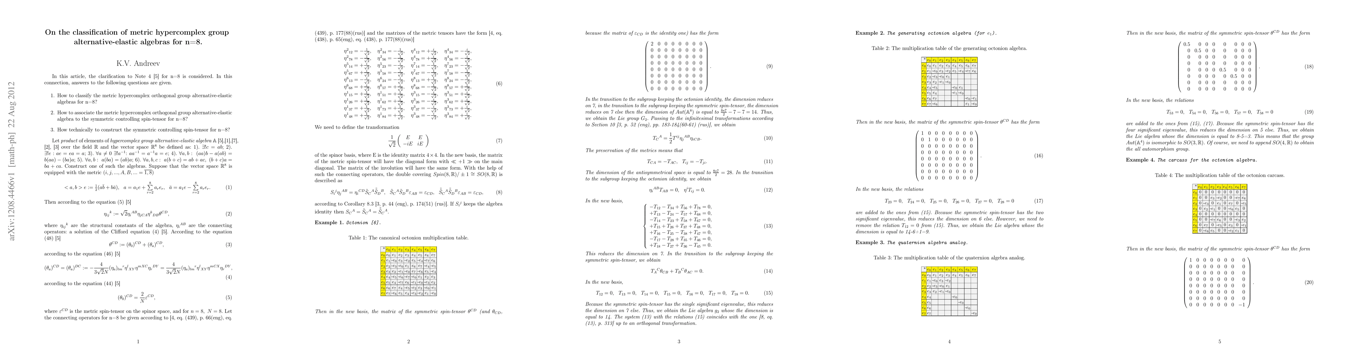 This paper clarifies classification of specific algebraic structures for n=8, detailing methods to categorize metric hypercomplex orthogonal group alternative-elastic algebras and associate them with symmetric controlling spinors. It also outlines the technical construction of symmetric controlling spinors for n=8, placing octonions within this classification and describing their class.