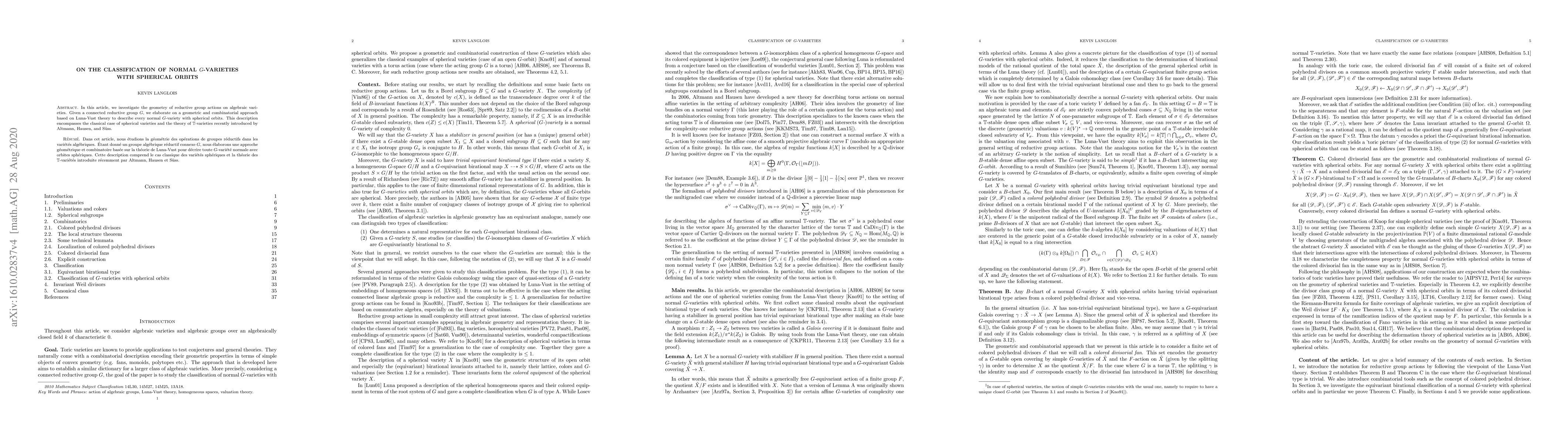 This paper explores the classification of normal $G$-varieties with spherical orbits using a geometric and combinatorial approach based on Luna-Vust theory, extending the classical theory of spherical varieties and incorporating the recent $\mathbb{T}$-varieties.