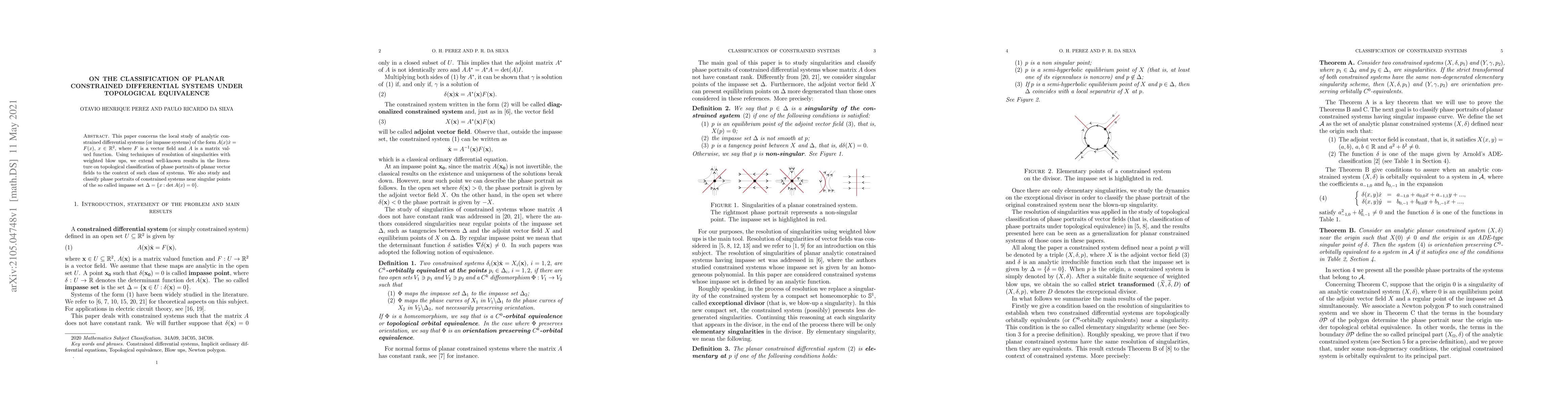 This paper concerns the local study of analytic constrained differential systems (or impasse systems) of the form $A(x)\dot{x} = F(x)$, $x\in\mathbb{R}^{2}$, where $F$ is a vector field and $A$ is a matrix valued function. Using techniques of resolution of singularities with weighted blow ups, we extend well-known results in the literature on topological classification of phase portraits of planar vector fields to the context of such class of systems. We also study and classify phase portraits of constrained systems near singular points of the so called impasse set $\Delta=\{x:\det A (x) = 0\}$.