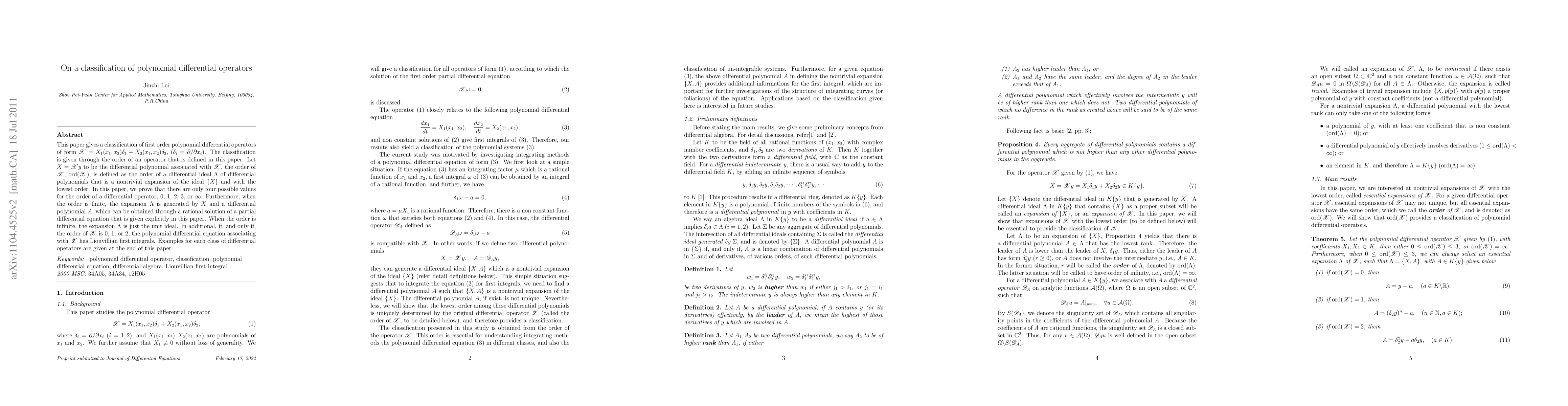 This paper gives a classification of first order polynomial differential operators of form $\mathscr{X} = X_1(x_1,x_2)\delta_1 + X_2(x_1,x_2)\delta_2$, $(\delta_i = \partial/\partial x_i)$. The classification is given through the order of an operator that is defined in this paper. Let $X=\mathscr{X}y$ to be the differential polynomial associated with $\mathscr{X}$, the order of $\mathscr{X}$, $\mathrm{ord}(\mathscr{X})$, is defined as the order of a differential ideal $\Lambda$ of differential polynomials that is a nontrivial expansion of the ideal $\{X\}$ and with the lowest order. In this paper, we prove that there are only four possible values for the order of a differential operator, 0, 1, 2, 3, or $\infty$. Furthermore, when the order is finite, the expansion $\Lambda$ is generated by $X$ and a differential polynomial $A$, which can be obtained through a rational solution of a partial differential equation that is given explicitly in this paper. When the order is infinite, the expansion $\Lambda$ is just the unit ideal. In additional, if, and only if, the order of $\mathscr{X}$ is 0, 1, or 2, the polynomial differential equation associating with $\mathscr{X}$ has Liouvillian first integrals. Examples for each class of differential operators are given at the end of this paper.
