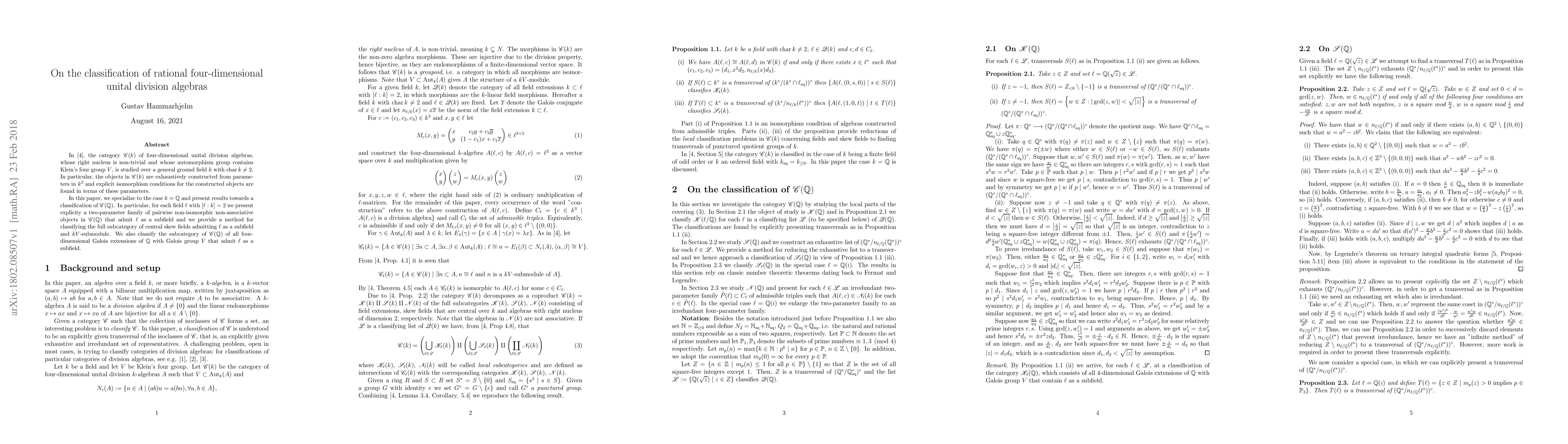 In a paper by E. Dieterich 2017, the category $\mathscr{C}(k)$ of four-dimensional unital division algebras, whose right nucleus is non-trivial and whose automorphism group contains Klein's four group $V$, is studied over a general ground field $k$ with $\mathrm{char}\,k\neq 2$. In particular, the objects in $\mathscr{C}(k)$ are exhaustively constructed from parameters in $k^3$ and explicit isomorphism conditions for the constructed objects are found in terms of these parameters. In this paper, we specialize to the case $k=\mathbb{Q}$ and present results towards a classification of $\mathscr{C}(\mathbb{Q})$. In particular, for each field $\ell$ with $[\ell:k]=2$ we present explicity a two-parameter family of pairwise non-isomorphic non-associative objects in $\mathscr{C}(\mathbb{Q})$ that admit $\ell$ as a subfield and we provide a method for classifying the full subcategory of central skew fields admitting $\ell$ as a subfield and $kV$-submodule. We also classify the subcategory of $\mathscr{C}(\mathbb{Q})$ of all four-dimensional Galois extensions of $\mathbb{Q}$ with Galois group $V$ that admit $\ell$ as a subfield.