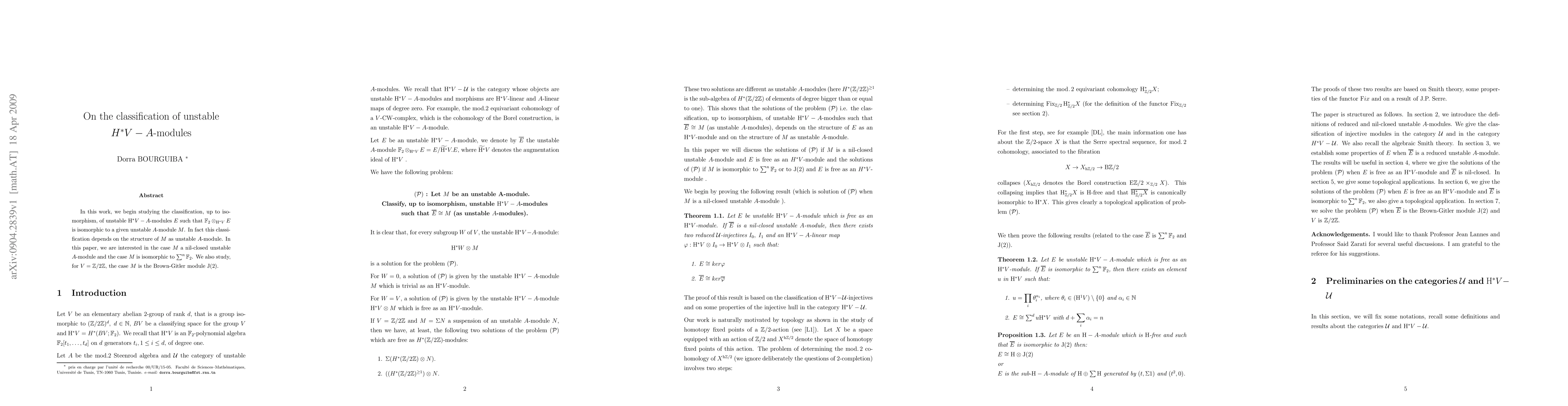 This paper explores the classification of unstable H*V-A-modules E where the tensor product of F_2 and E over H*V matches a specified unstable A-module, focusing on their isomorphism types. The aim is to provide a structured understanding of such modules within this context.