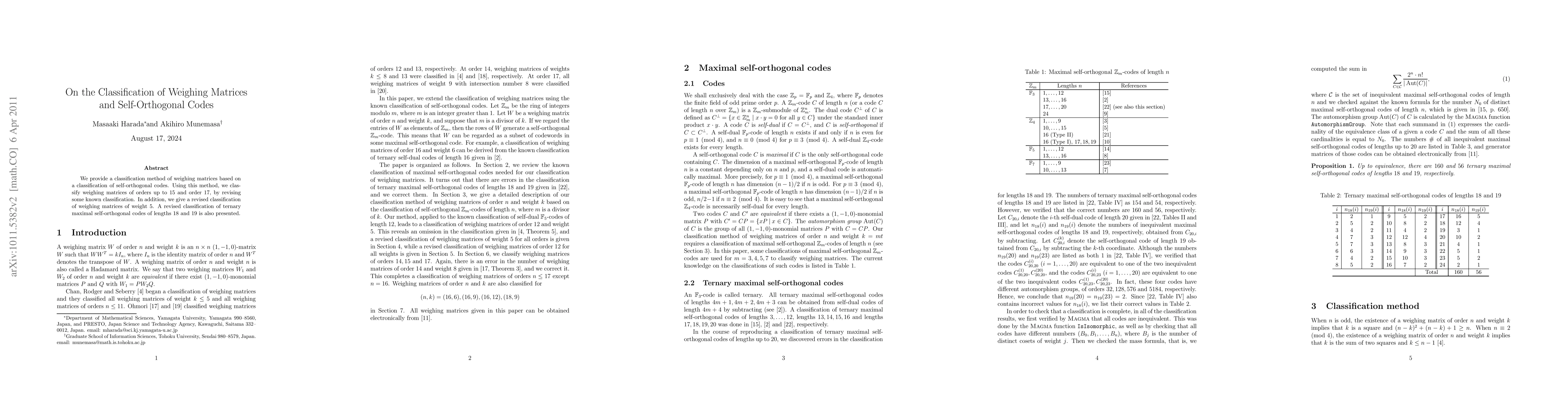 This paper classifies weighing matrices up to order 15 and order 17 using a method based on the classification of self-orthogonal codes, revising some existing classifications. It also provides a revised classification of ternary maximal self-orthogonal codes of lengths 18 and 19.