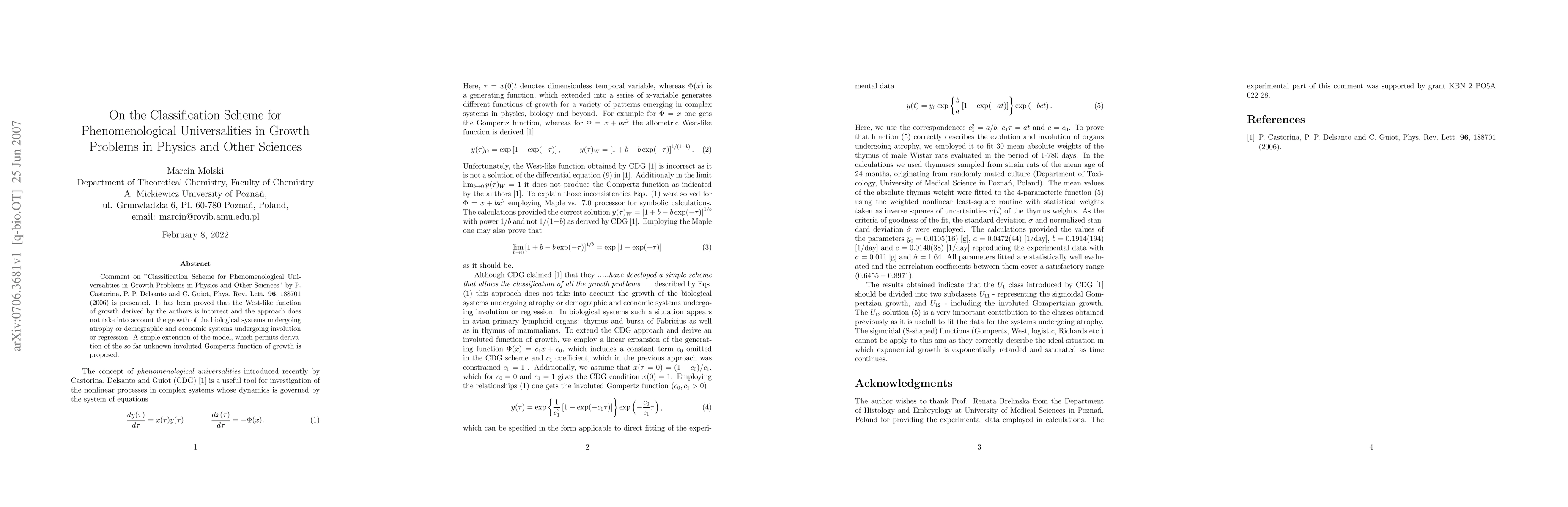 Comment on "Classification Scheme for Phenomenological Universalities in Growth Problems in Physics and Other Sciences" by P. Castorina, P. P. Delsanto and C. Guiot, Phys. Rev. Lett. {\bf 96}, 188701 (2006) is presented. It has been proved that the West-like function of growth derived by the authors is incorrect and the approach does not take into account the growth of the biological systems undergoing atrophy or demographic and economic systems undergoing involution or regression. A simple extension of the model, which permits derivation of the so far unknown involuted Gompertz function of growth is proposed.
