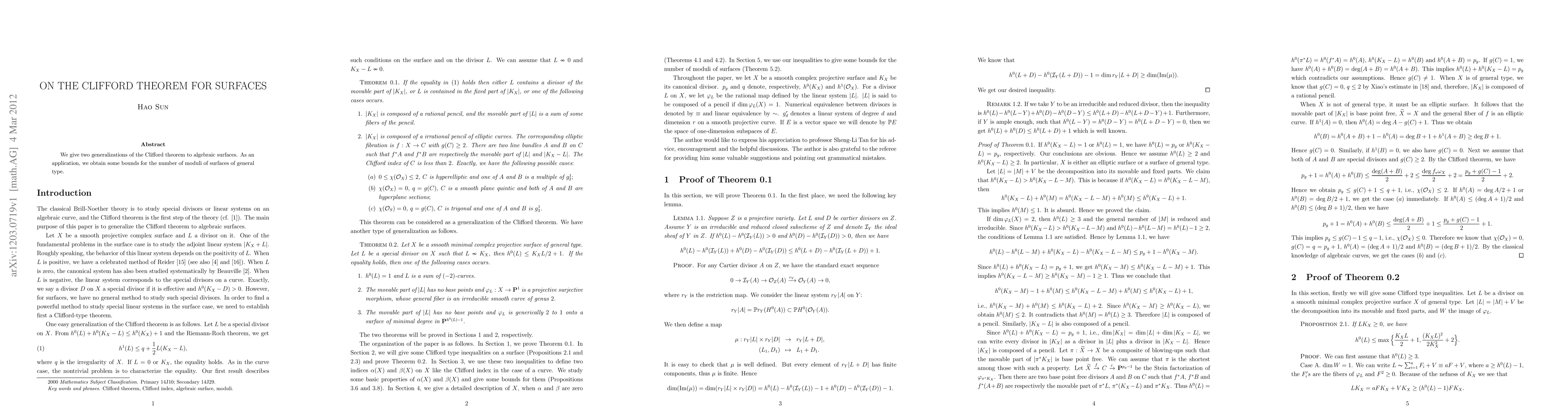 Summary: This paper presents two generalizations of the Clifford theorem for algebraic surfaces and uses these to derive bounds on the moduli of surfaces of general type. The results provide new insights into the structure of such surfaces.