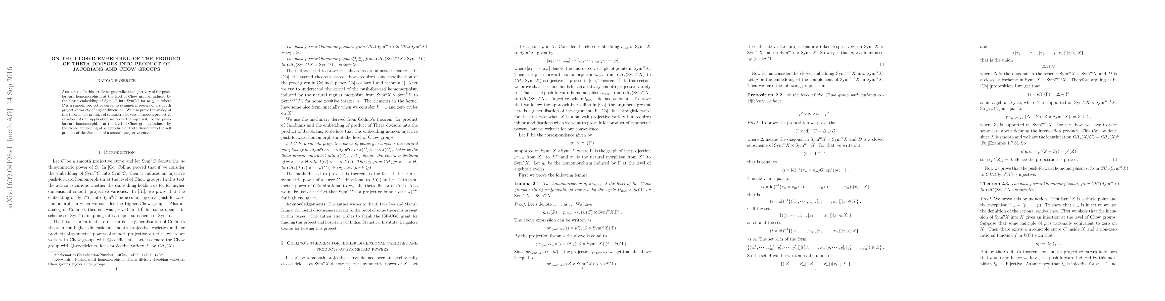 In this article we generalize the injectivity of the push-forward homomorphism at the level of Chow groups, induced by the closed embedding of $\Sym^m C$ into $\Sym^n C$ for $m\leq n$, where $C$ is a smooth projective curve, to symmetric powers of a smooth projective variety of higher dimension. We also prove the analog of this theorem for product of symmetric powers of smooth projective varieties. As an application we prove the injectivity of the push-forward homomorphism at the level of Chow groups, induced by the closed embedding of self product of theta divisor into the self product of the Jacobian of a smooth projective curve.