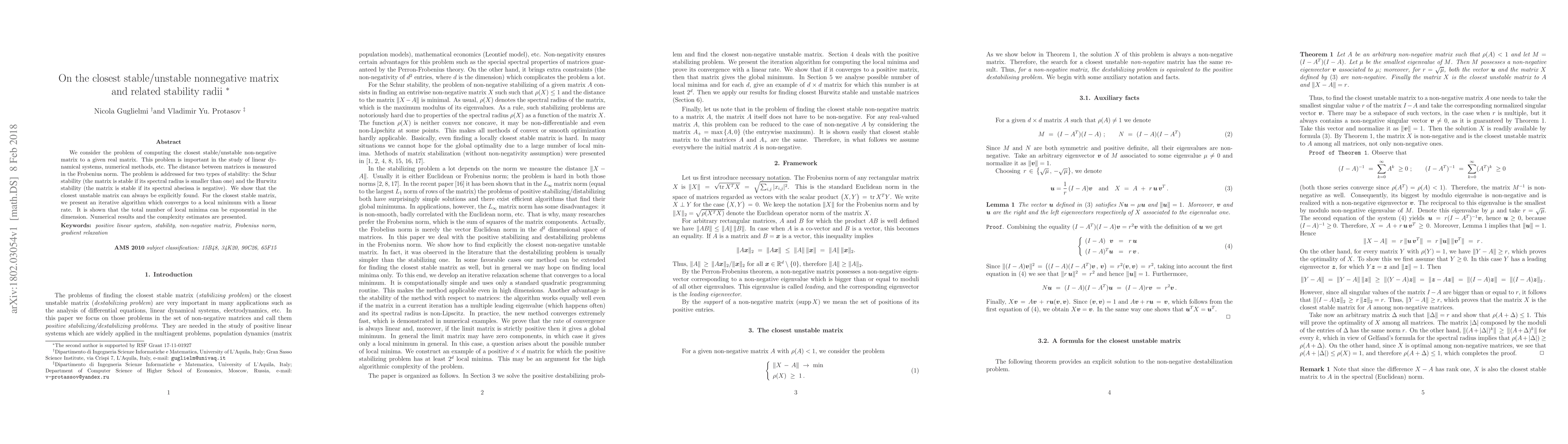 This paper solves for the closest stable/unstable non-negative matrix to a given real matrix, finding explicit solutions for unstable matrices and an iterative algorithm for stable matrices, with implications for linear dynamical systems and numerical methods.
