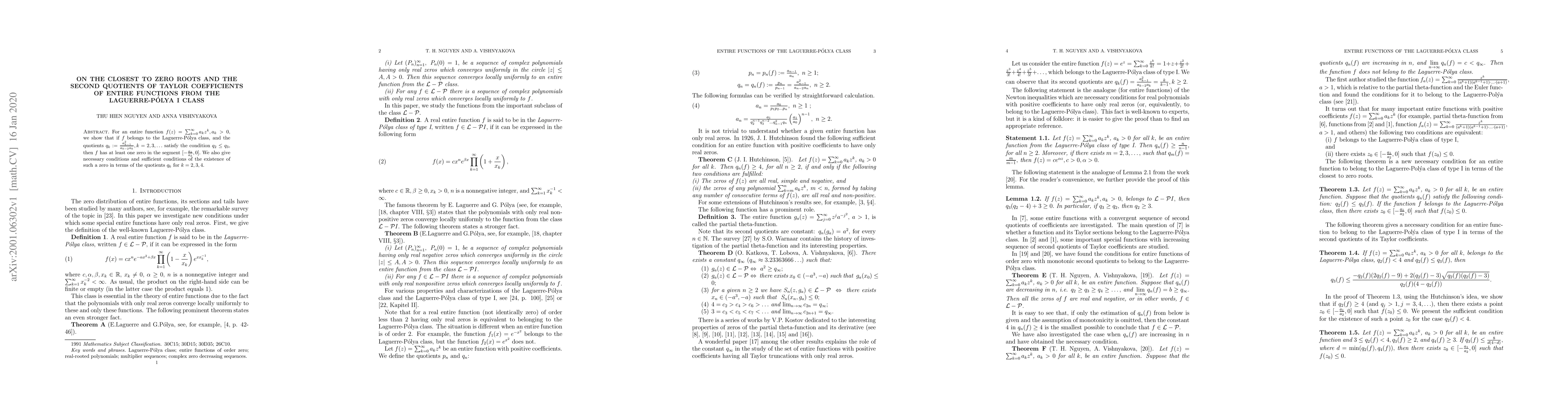 For an entire function $f(z) = \sum_{k=0}^\infty a_k z^k, a_k>0,$ we show that if $f$ belongs to the Laguerre-P\'olya class, and the quotients $q_k := \frac{a_{k-1}^2}{a_{k-2}a_k}, k=2, 3, \ldots $ satisfy the condition $q_2 \leq q_3,$ then $f$ has at least one zero in the segment $[-\frac{a_1}{a_2},0].$ We also give necessary conditions and sufficient conditions of the existence of such a zero in terms of the quotients $q_k$ for $k=2,3, 4.$