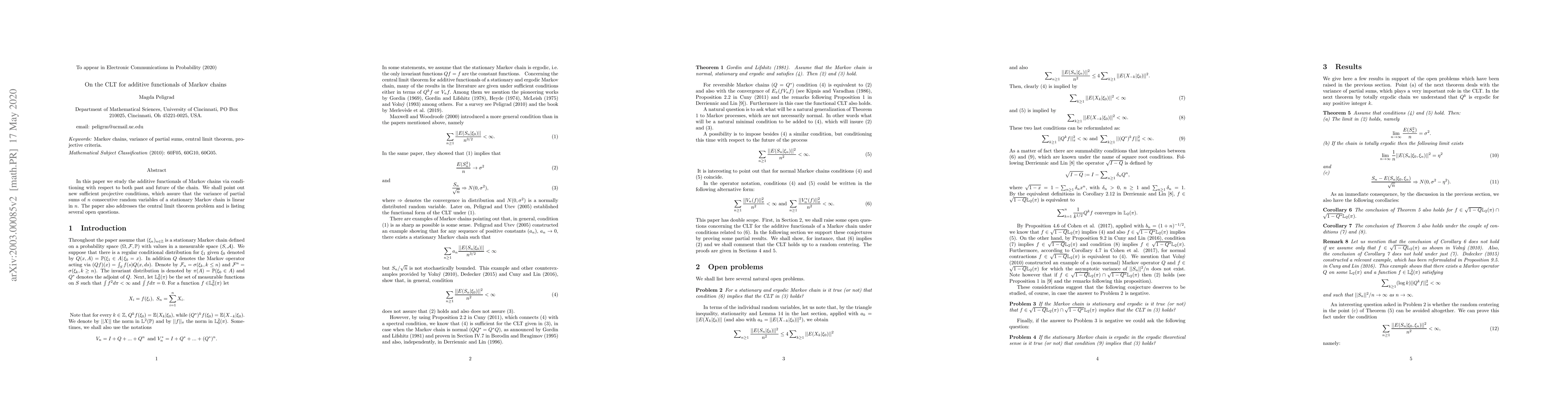 This paper investigates additive functionals of Markov chains, establishing new projective conditions that ensure the variance of partial sums grows linearly with n. It also explores the central limit theorem for these functionals and highlights several unresolved questions.