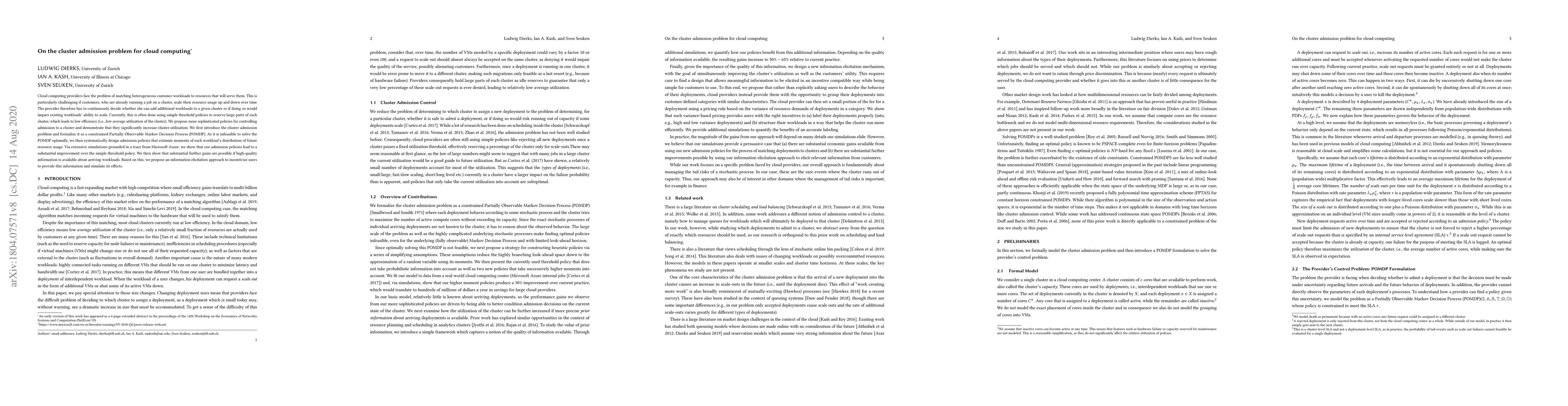 This research introduces the cluster admission problem in cloud computing, where providers must efficiently match workloads to resources. They propose sophisticated admission policies using constrained Partially Observable Markov Decision Processes (POMDPs) to improve cluster utilization, demonstrating significant gains over simple threshold policies through extensive simulations. Further improvements are shown possible with high-quality workload information, leading to an information elicitation approach for incentivizing users to share such data.