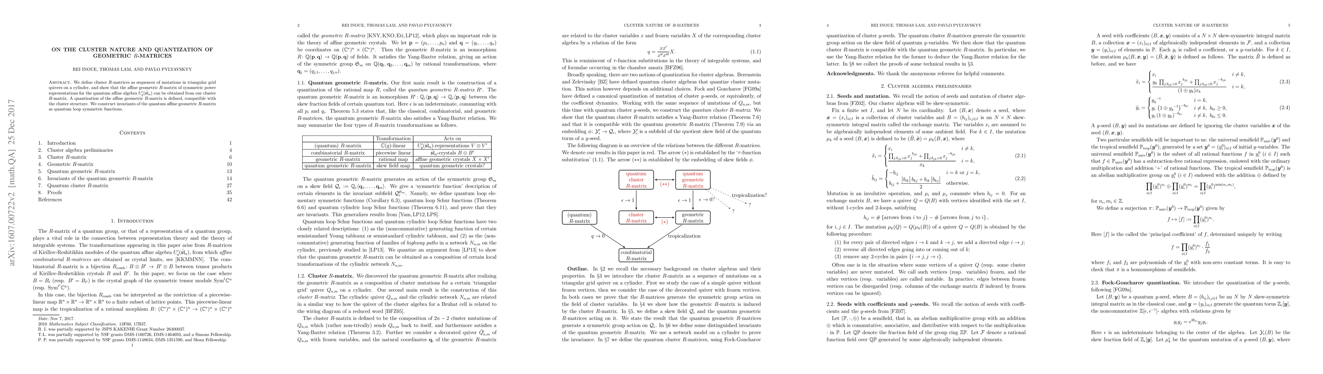 This paper defines cluster $R$-matrices as sequences of mutations in triangular grid quivers, demonstrating their connection to the affine geometric $R$-matrix of symmetric power representations in $U_q^\prime(\hat{\mathfrak{sl}}_n)$. It also quantizes the affine geometric $R$-matrix, constructing invariants as quantum loop symmetric functions.