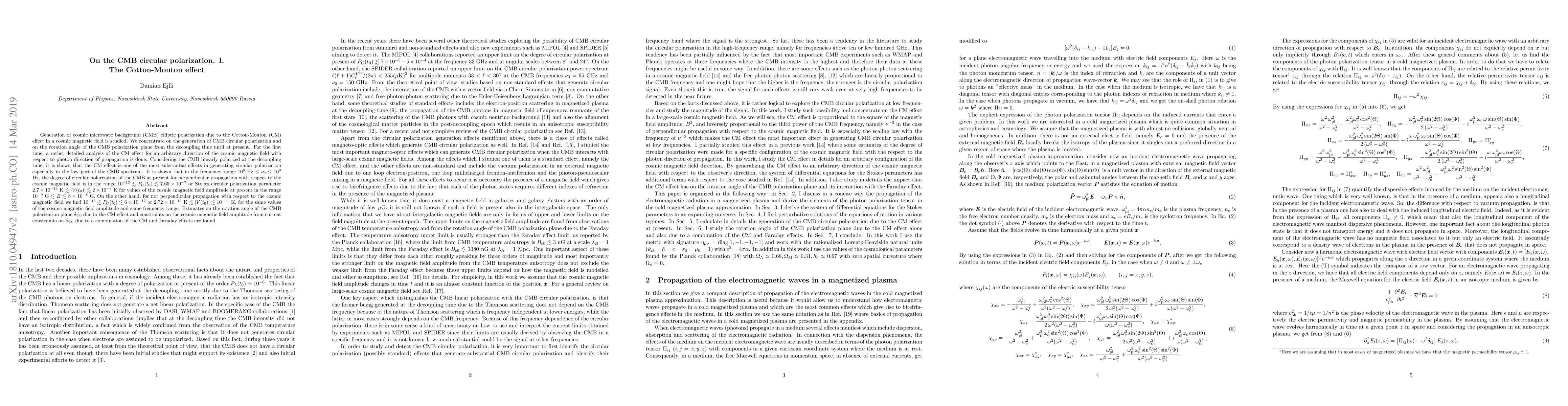 This paper investigates the Cotton-Mouton effect's role in generating cosmic microwave background (CMB) circular polarization, finding it significant in the low CMB spectrum. The study estimates the degree of circular polarization and rotation angle of the CMB polarization plane, providing constraints on the cosmic magnetic field amplitude.