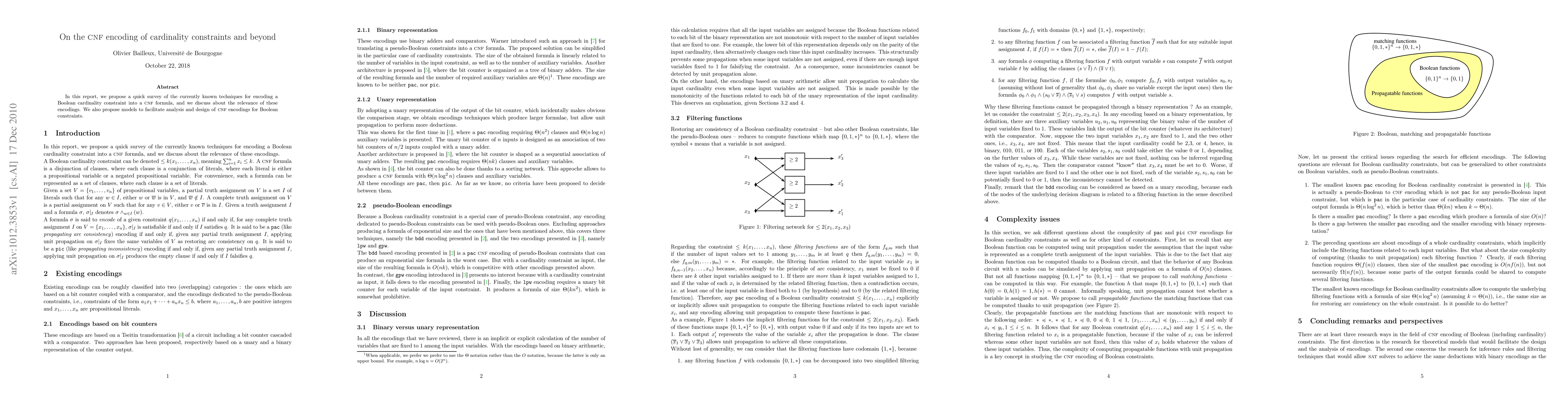 In this report, we propose a quick survey of the currently known techniques for encoding a Boolean cardinality constraint into a CNF formula, and we discuss about the relevance of these encodings. We also propose models to facilitate analysis and design of CNF encodings for Boolean constraints.