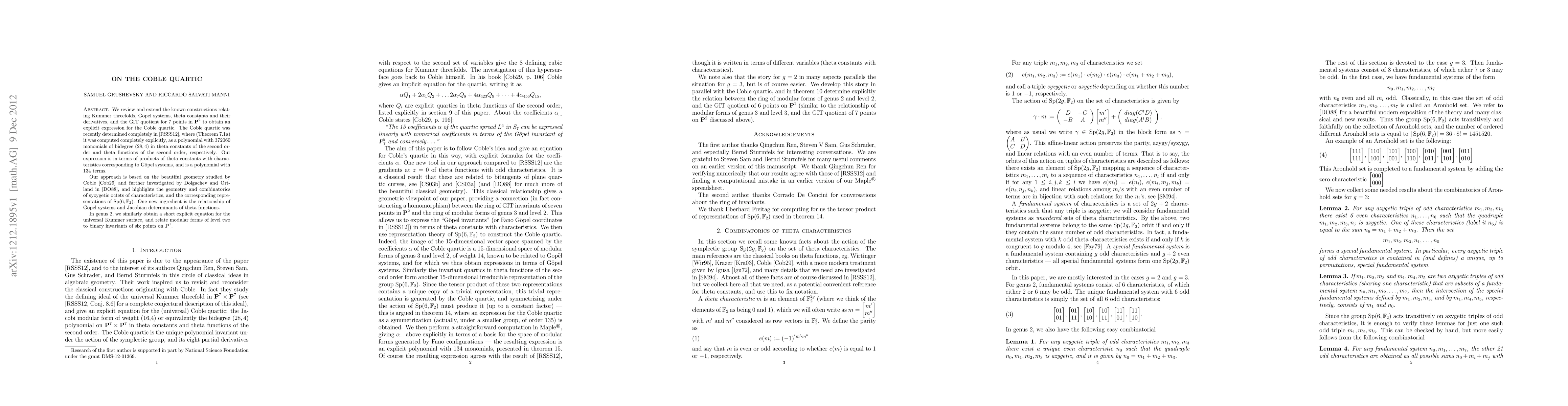 We review and extend the known constructions relating Kummer threefolds, Gopel systems, theta constants and their derivatives, and the GIT quotient for 7 points in P^2 to obtain an explicit expression for the Coble quartic. The Coble quartic was recently determined completely by Q.Ran, S.Sam, G.Schrader, and B.Sturmfels, who computed it completely explicitly, as a polynomial with 372060 monomials of bidegree (28,4) in theta constants of the second order and theta functions of the second order, respectively. Our expression is in terms of products of theta constants with characteristics corresponding to Gopel systems, and is a polynomial with 134 terms. Our approach is based on the beautiful geometry studied by Coble and further investigated by Dolgachev and Ortland, and highlights the geometry and combinatorics of syzygetic octets of characteristics, and the corresponding representations of the symplectic group. One new ingredient is the relationship of Gopel systems and Jacobian determinants of theta functions. In genus 2, we similarly obtain a short explicit equation for the universal Kummer surface, and relate modular forms of level two to binary invariants of six points on P^1.