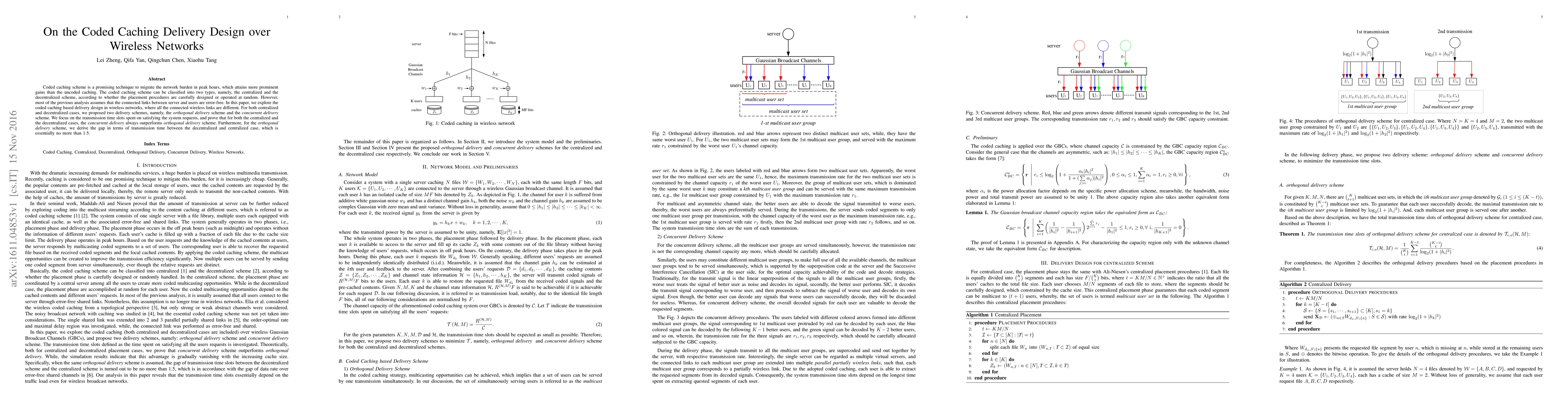 This paper investigates coded caching schemes for wireless networks, proposing two delivery methods—orthogonal and concurrent—for both centralized and decentralized scenarios. It demonstrates that concurrent delivery outperforms orthogonal delivery in terms of transmission time, and analyzes the performance gap between centralized and decentralized orthogonal delivery.