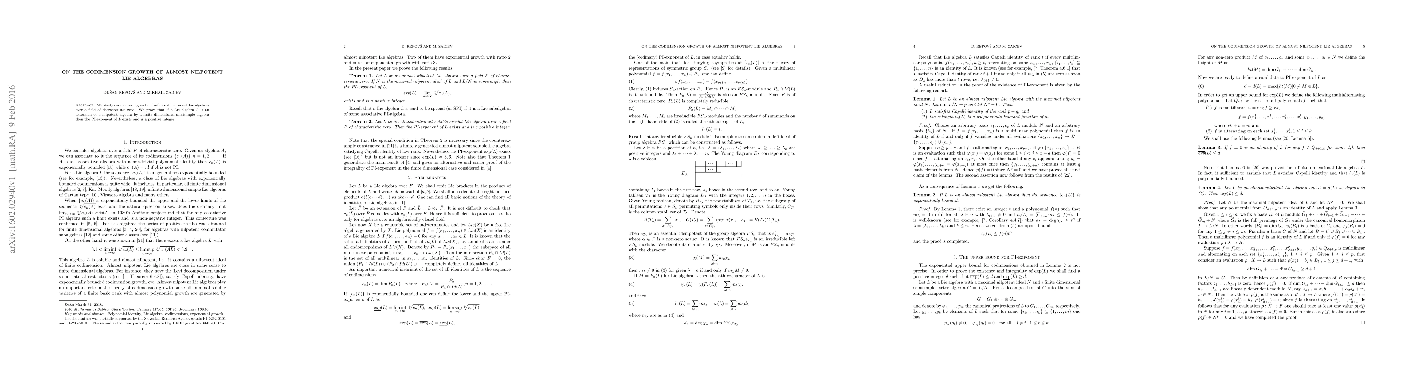 Summary: This paper investigates the codimension growth of infinite-dimensional almost nilpotent Lie algebras over fields of characteristic zero. It proves that if a Lie algebra extends a nilpotent algebra by a finite-dimensional semisimple algebra, the PI-exponent of the Lie algebra exists and is a positive integer.