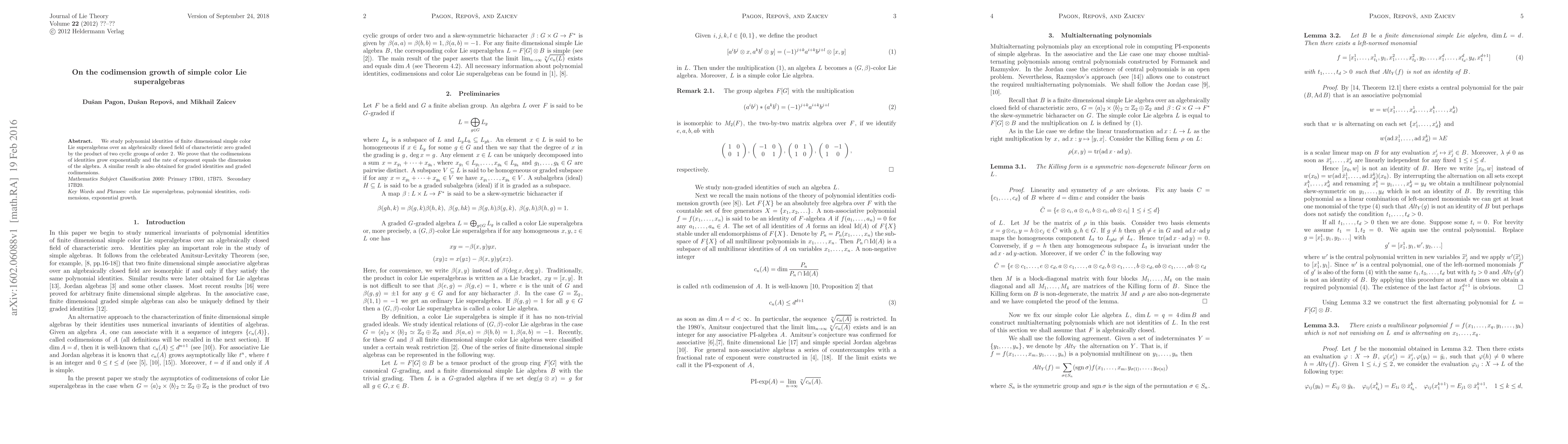 This paper investigates polynomial identities in finite-dimensional simple color Lie superalgebras, demonstrating that their codimensions grow exponentially with a rate equal to the dimension of the algebra. Results extend to graded identities and their codimensions.