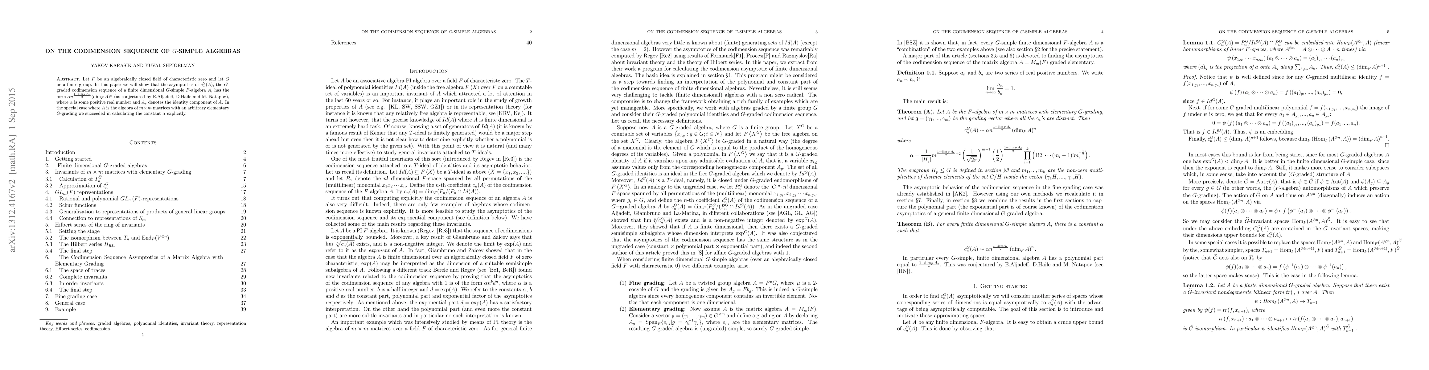 In the 80's, Regev, using results of Formanek, Procesi and Razmyslov in invariant theory and Hilbert series', determined asymptotically the codimension sequence of mXm matrices over an algebraically closed field of characteristic zero. Inspired by Regev's ideas, we found that the asymptotics of $c_{n}^{G}(A)$, the G graded codimension sequence of a finite dimensional G simple algebra A, is equal to $\alpha n^{\frac{1-\dim(A_{e})}{2}}(\dim(A)^{n} $ (this was conjectured by E.Aljadeff, D.Haile and M. Natapov), where \alpha is not yet determined number. Moreover, in the case where A is the algebra of mXm matrices with an arbitrary elementary G-grading we also manged to calculate \alpha.