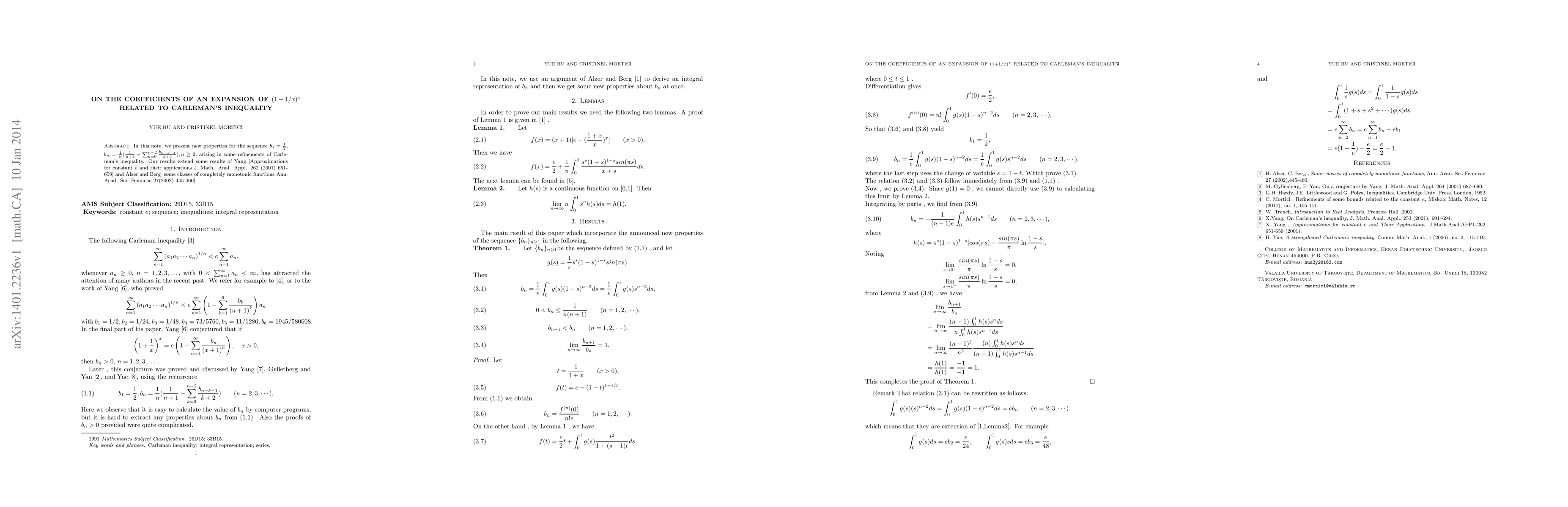 In this note, we present new properties for a sequence arising in some refinements of Carleman's inequality. Our results extend some results of Yang [Approximations for constant e and their applications J. Math. Anal. Appl. 262 (2001) 651-659] and Alzer and Berg [some classes of completely monotonic functions Ann. Acad. Sci. Fennicae 27(2002) 445-460].