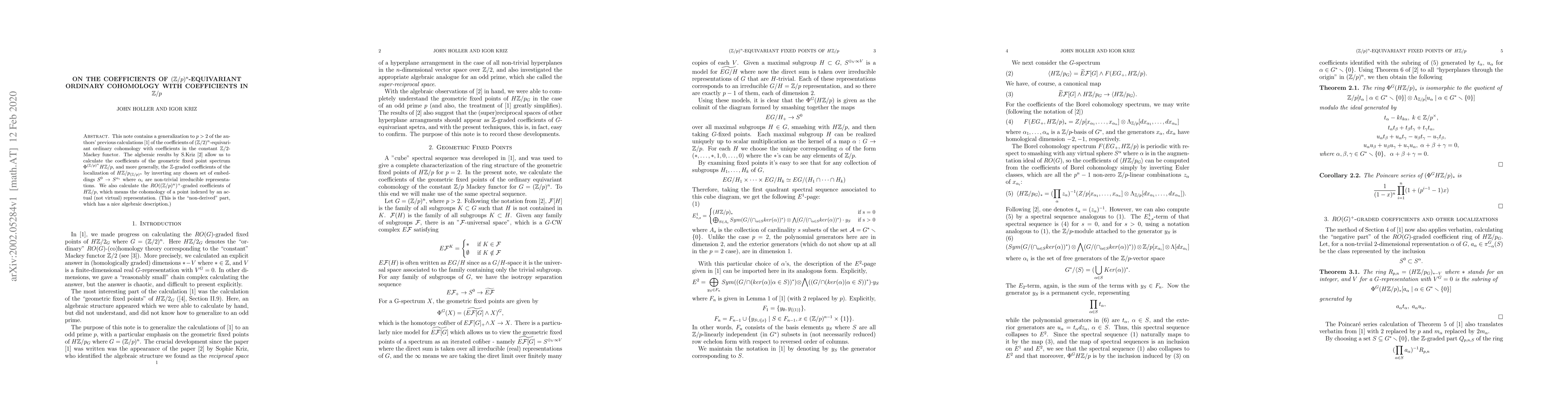 This note contains a generalization to $p>2$ of the authors' previous calculations of the coefficients of $(\mathbb{Z}/2)^n$-equivariant ordinary cohomology with coefficients in the constant $\mathbb{Z}/2$-Mackey functor. The algberaic results by S.Kriz allow us to calculate the coefficients of the geometric fixed point spectrum $\Phi^{(\mathbb{Z}/p)^n}H\mathbb{Z}/p$, and more generally, the $\mathbb{Z}$-graded coefficients of the localization of $H\mathbb{Z}/p_{(\mathbb{Z}/p)^n}$ by inverting any chosen set of embeddings $S^0\rightarrow S^{\alpha_i}$ where $\alpha_i$ are non-trivial irreducible representations. We also calculate the $RO(G)^+$-graded coefficients of $H\mathbb{Z}/p_{(\mathbb{Z}/p)^n}$, which means the cohomology of a point indexed by an actual (not virtual) representation. (This is the "non-derived" part, which has a nice algebraic description.)
