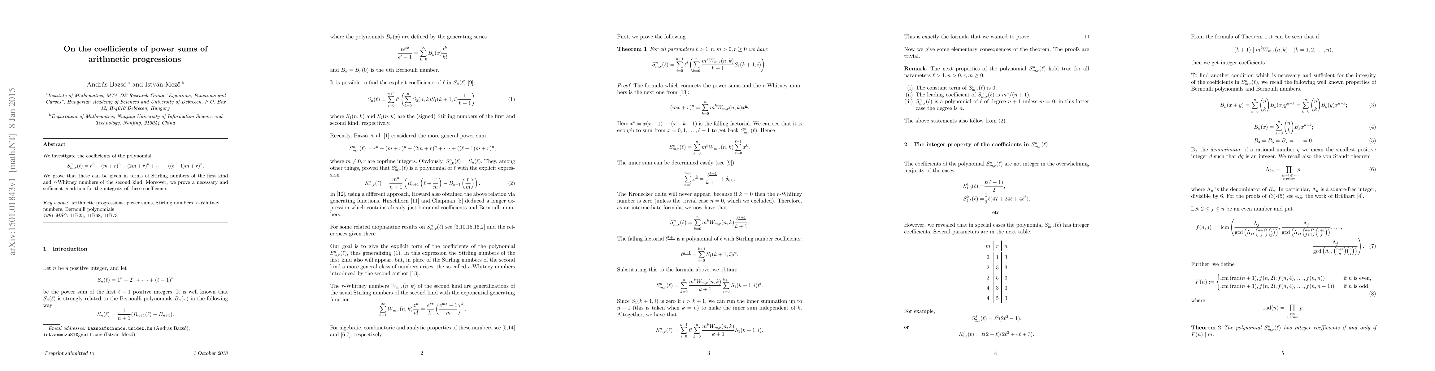 We investigate the coefficients of the polynomial \[ S_{m,r}^n(\ell)=r^n+(m+r)^n+(2m+r)^n+\cdots+((\ell-1)m+r)^n. \] We prove that these can be given in terms of Stirling numbers of the first kind and $r$-Whitney numbers of the second kind. Moreover, we prove a necessary and sufficient condition for the integrity of these coefficients.