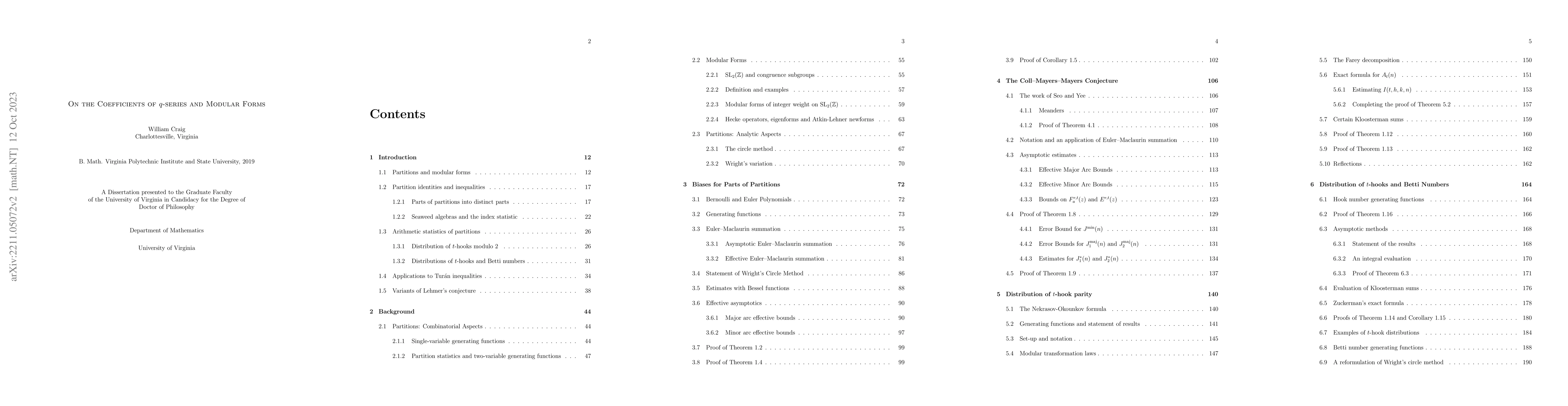 In this Ph.D dissertation (University of Virginia, 2022), we prove results about the coefficients of partition-theoretic generating functions and of coefficients of integer weight modular forms. Using various forms of the circle method, we prove results about the distribution of partition statistics in residue classes modulo $t$. For example, we prove that the parts of partitions into distinct parts are equidistributed modulo $t$ (but that certain biases occur nonetheless) and that the number of $t$-hooks in a partition is generally not equidistributed modulo primes. We also obtain exact formulas for the $t$-hook counting functions using modular transformation laws. We also employ the circle method to prove a conjecture of Coll, Mayers and Mayers that the $q$-series $(q, -q^3; q^4)_\infty^{-1}$ has non-negative coefficients. These topics cover Chapters 3-6. Chapter 7 gives an application of partition asymptotics for proving hyperbolicity of Jensen polynomials using the criterion of Griffin, Ono, Rolen and Zagier. Chapter 8 gives a new method for solving equations of the form $a_f(n) = \alpha$, where $\alpha \in \mathbb{Z}$ is odd and $a_f(n)$ are the coefficients of a normalized Hecke eigenform with trivial mod 2 Galois representation. The method is based on the primitive prime divisor theorem of Bilu, Hanrot, and Voutier along with methods in effective algebraic geometry for elliptic curves, hyperelliptic curves, and Thue equations.