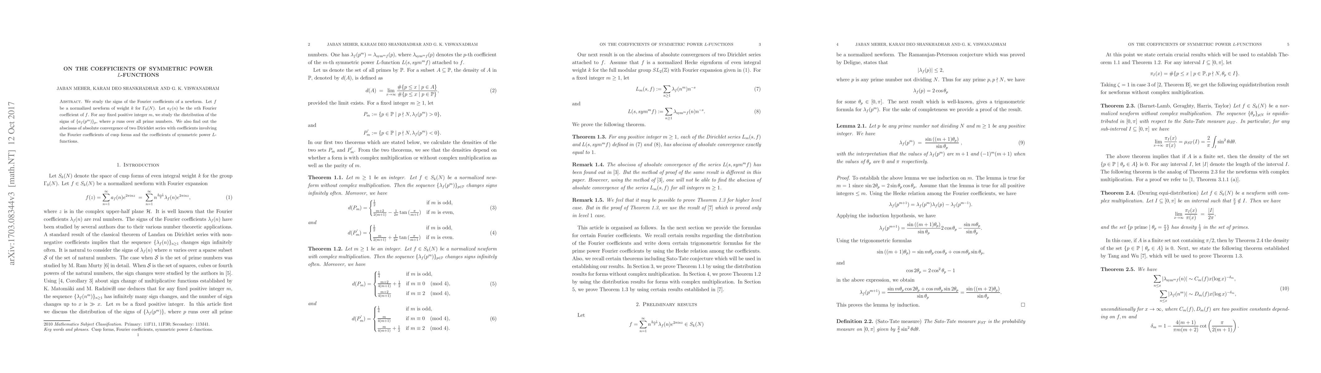 This paper investigates the distribution of signs of Fourier coefficients of a normalized newform $f$ for $\Gamma_0(N)$, specifically for prime powers $p^m$. It also determines the abscissas of absolute convergence for Dirichlet series involving these coefficients and those of symmetric power $L$-functions.