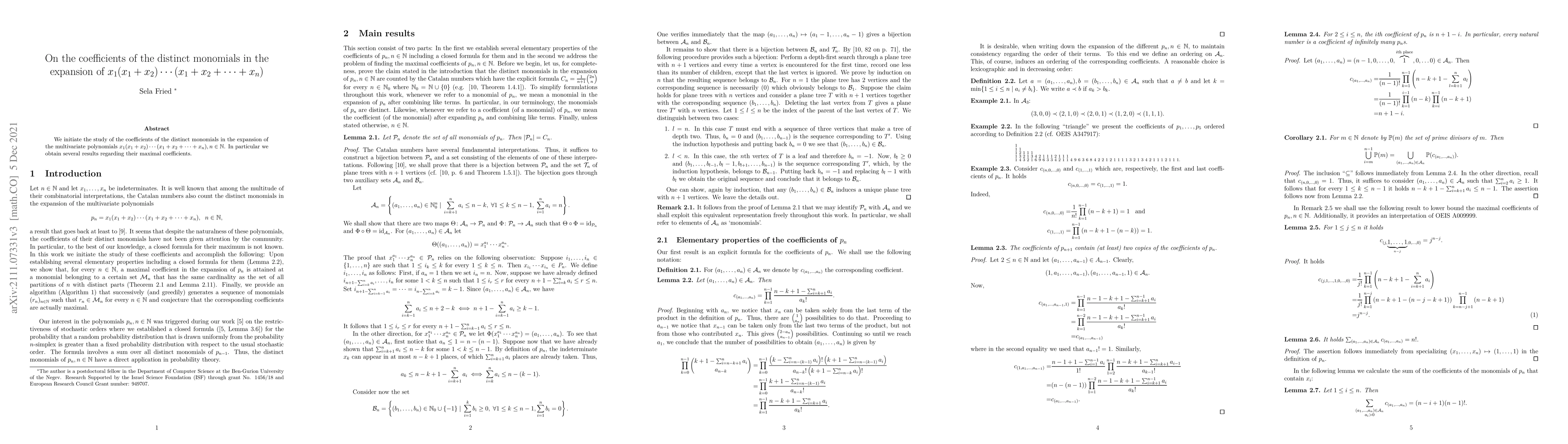 This paper investigates the coefficients of distinct monomials in the expansion of the polynomial $x_1(x_1+x_2)\cdots(x_1+x_2+\cdots+x_n)$, focusing on the maximal values of these coefficients. Several results are presented regarding the structure and properties of these coefficients.