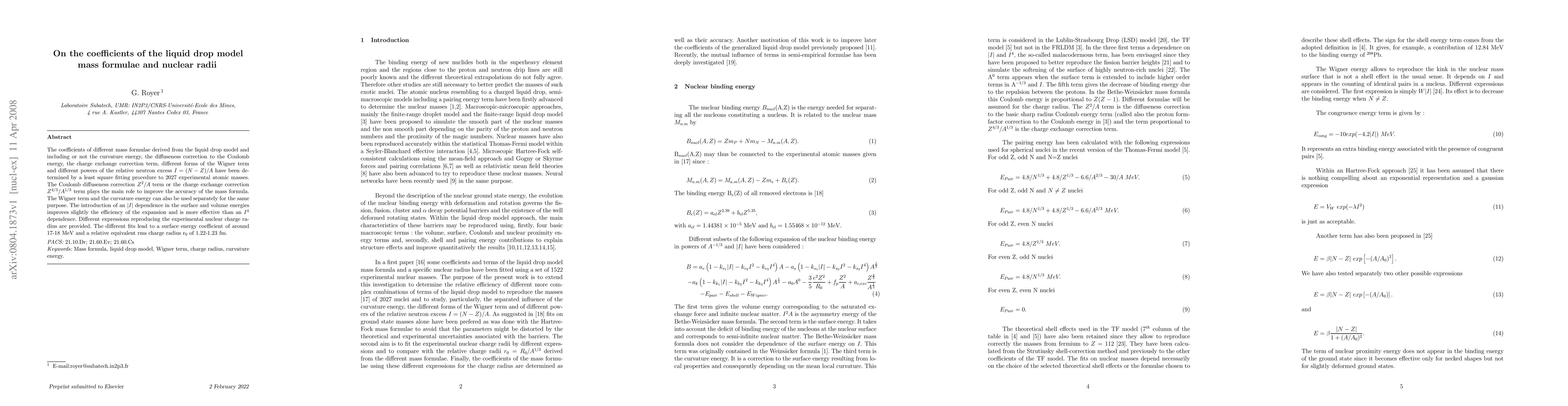 This paper determines coefficients for various mass formulae from the liquid drop model through least square fitting to 2027 experimental atomic masses, finding that the Coulomb diffuseness and charge exchange corrections significantly improve accuracy. The study also provides expressions for nuclear charge radii and estimates a surface energy coefficient around 17-18 MeV.