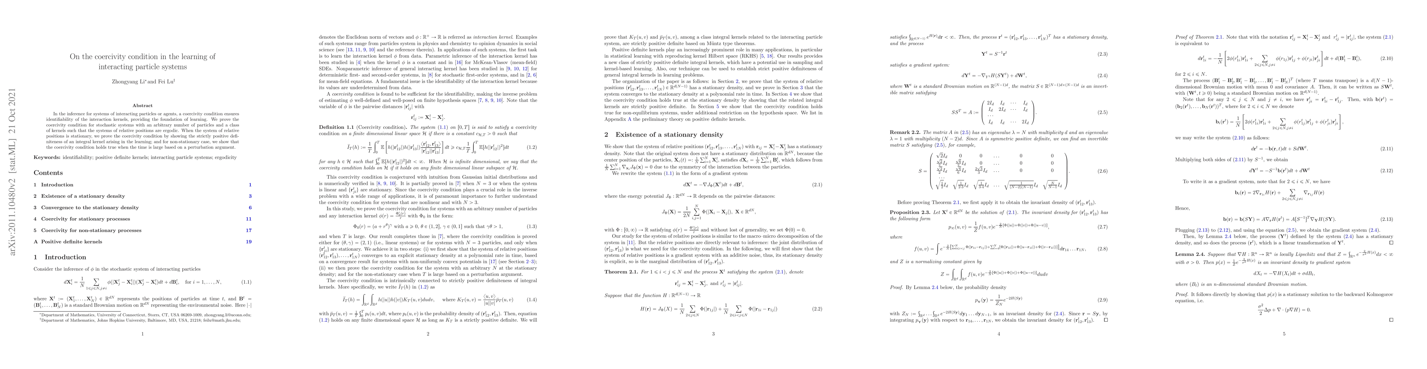 This paper demonstrates that for ergodic systems of interacting particles, the coercivity condition, which ensures identifiability of interaction functions, holds true due to the strictly positive definiteness of the integral kernel involved in nonparametric regression learning.