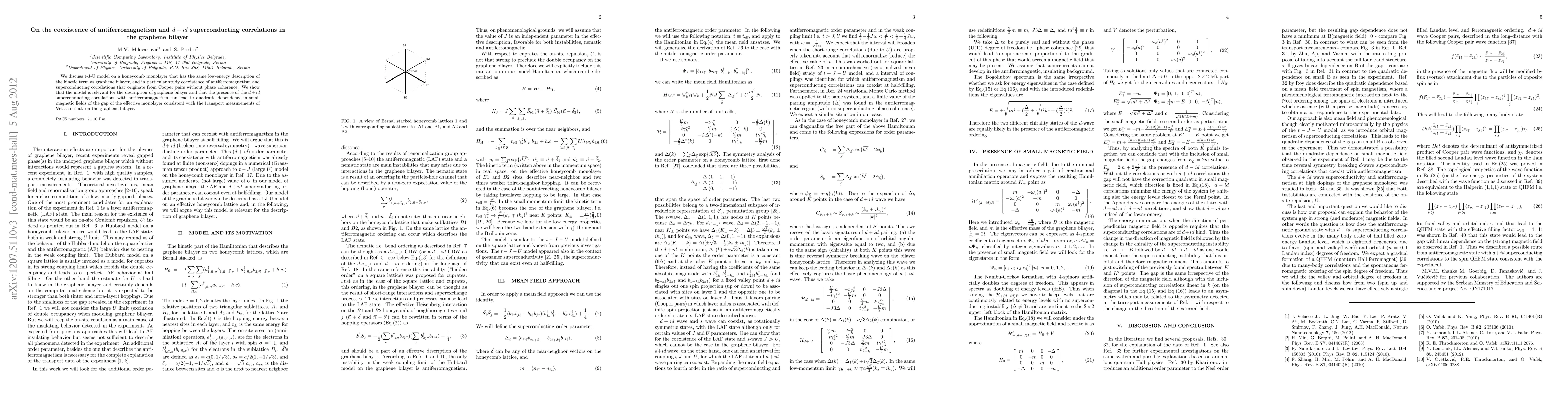 We discuss t-J-U model on a honeycomb monolayer that has the same low-energy description of the kinetic term as graphene bilayer, and in particular study coexistence of antiferromagnetism and superconducting correlations that originate from Cooper pairs without phase coherence. We show that the model is relevant for the description of graphene bilayer and that the presence of the d + i d superconducting correlations with antiferromagnetism can lead to quadratic dependence in small magnetic fields of the gap of the effective monolayer consistent with the transport measurements of Velasco et al. on the graphene bilayer.
