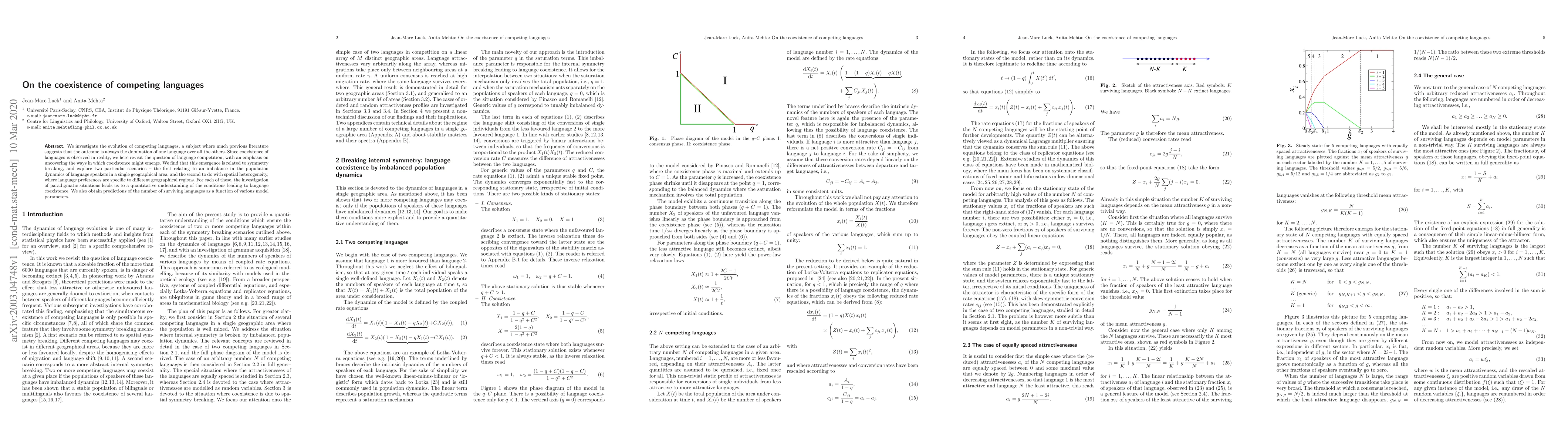 We investigate the evolution of competing languages, a subject where much previous literature suggests that the outcome is always the domination of one language over all the others. Since coexistence of languages is observed in reality, we here revisit the question of language competition, with an emphasis on uncovering the ways in which coexistence might emerge. We find that this emergence is related to symmetry breaking, and explore two particular scenarios -- the first relating to an imbalance in the population dynamics of language speakers in a single geographical area, and the second to do with spatial heterogeneity, where language preferences are specific to different geographical regions. For each of these, the investigation of paradigmatic situations leads us to a quantitative understanding of the conditions leading to language coexistence. We also obtain predictions of the number of surviving languages as a function of various model parameters.