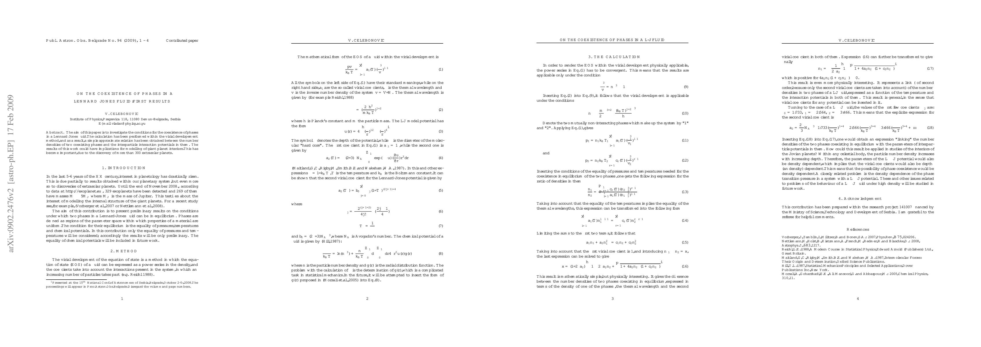 The aim of this paper is to investigate the conditions for the coexistence of phases in a Lennard Jones fluid. The calculation has been performed within the virial developement mathod and, as a result, a simple approximate relation has been obtained between the number densities of two coexisting densities and the interparticle potentials in them. The calculation is preliminary,in the sense that it does not take into account the equality of the chemical potentials. The results of this work may have implications for modelling of the giant planets. More than 300 exoplanets have been discovered, so this has become more important than ever.