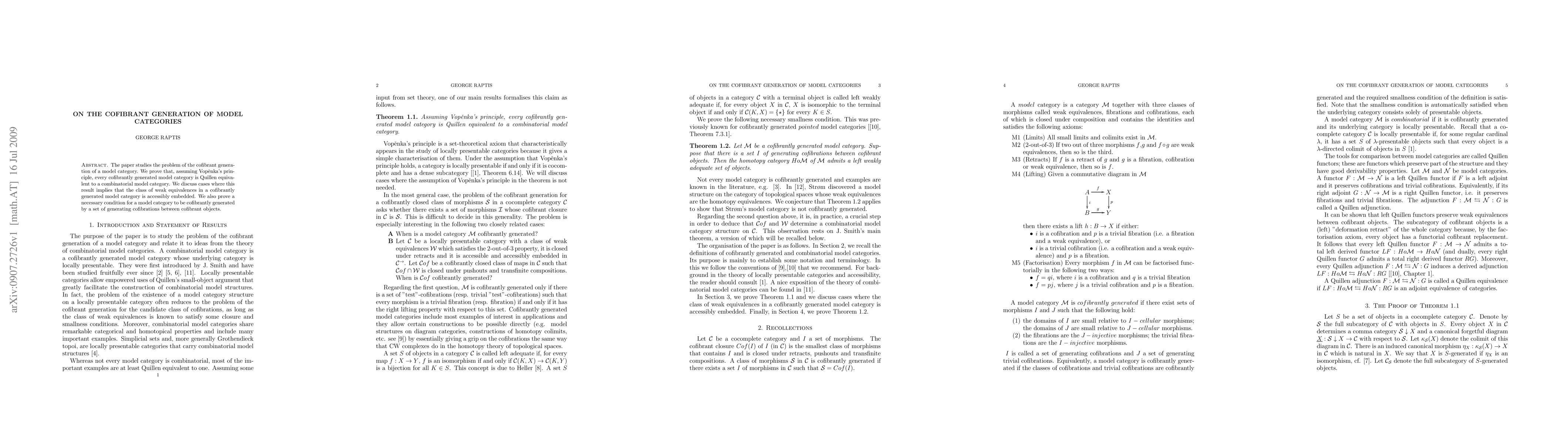The paper studies the problem of the cofibrant generation of a model category. We prove that, assuming Vop\v{e}nka's principle, every cofibrantly generated model category is Quillen equivalent to a combinatorial model category. We discuss cases where this result implies that the class of weak equivalences in a cofibrantly generated model category is accessibly embedded. We also prove a necessary condition for a model category to be cofibrantly generated by a set of generating cofibrations between cofibrant objects.