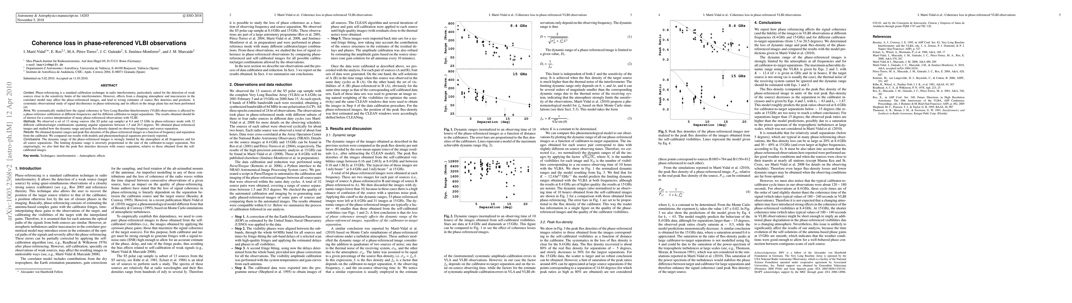 This study investigates the coherence loss in phase-referenced VLBI observations, finding that atmospheric effects and correlator inaccuracies significantly limit dynamic range and peak flux densities. The results indicate that the dynamic range is inversely proportional to the sine of the calibrator-to-target separation, highlighting the need for improved calibration techniques in VLBI observations.