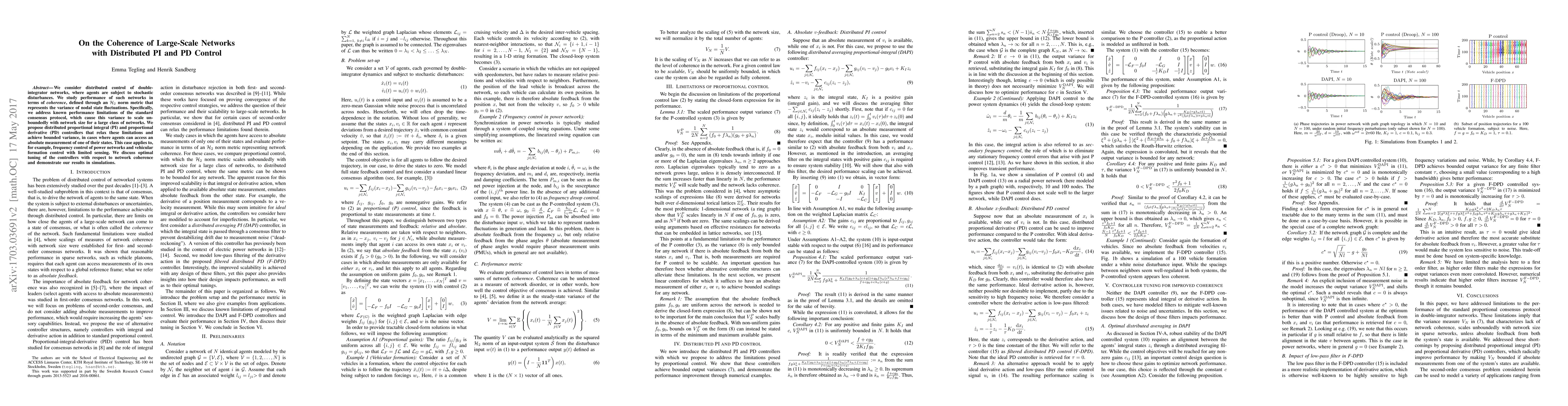 This paper proposes distributed PI and PD controllers to improve coherence in large-scale double-integrator networks under stochastic disturbances, addressing the unbounded variance issue of standard consensus protocols. The proposed controllers achieve bounded variance, demonstrated through optimal tuning and simulation results.