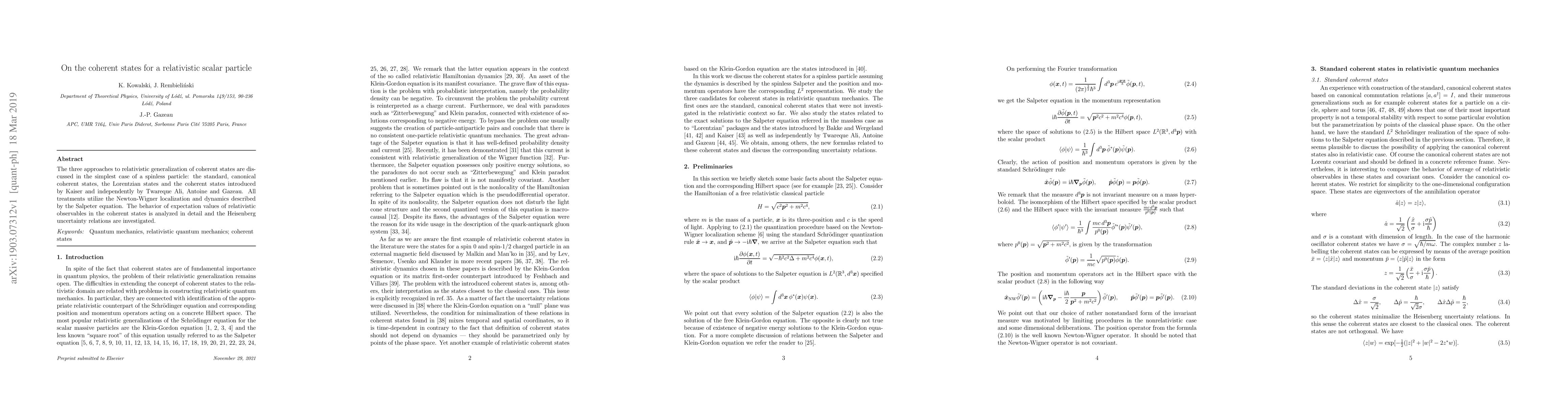 The three approaches to relativistic generalization of coherent states are discussed in the simplest case of a spinless particle: the standard, canonical coherent states, the Lorentzian states and the coherent states introduced by Kaiser and independently by Twareque Ali, Antoine and Gazeau. All treatments utilize the Newton-Wigner localization and dynamics described by the Salpeter equation. The behavior of expectation values of relativistic observables in the coherent states is analyzed in detail and the Heisenberg uncertainty relations are investigated.